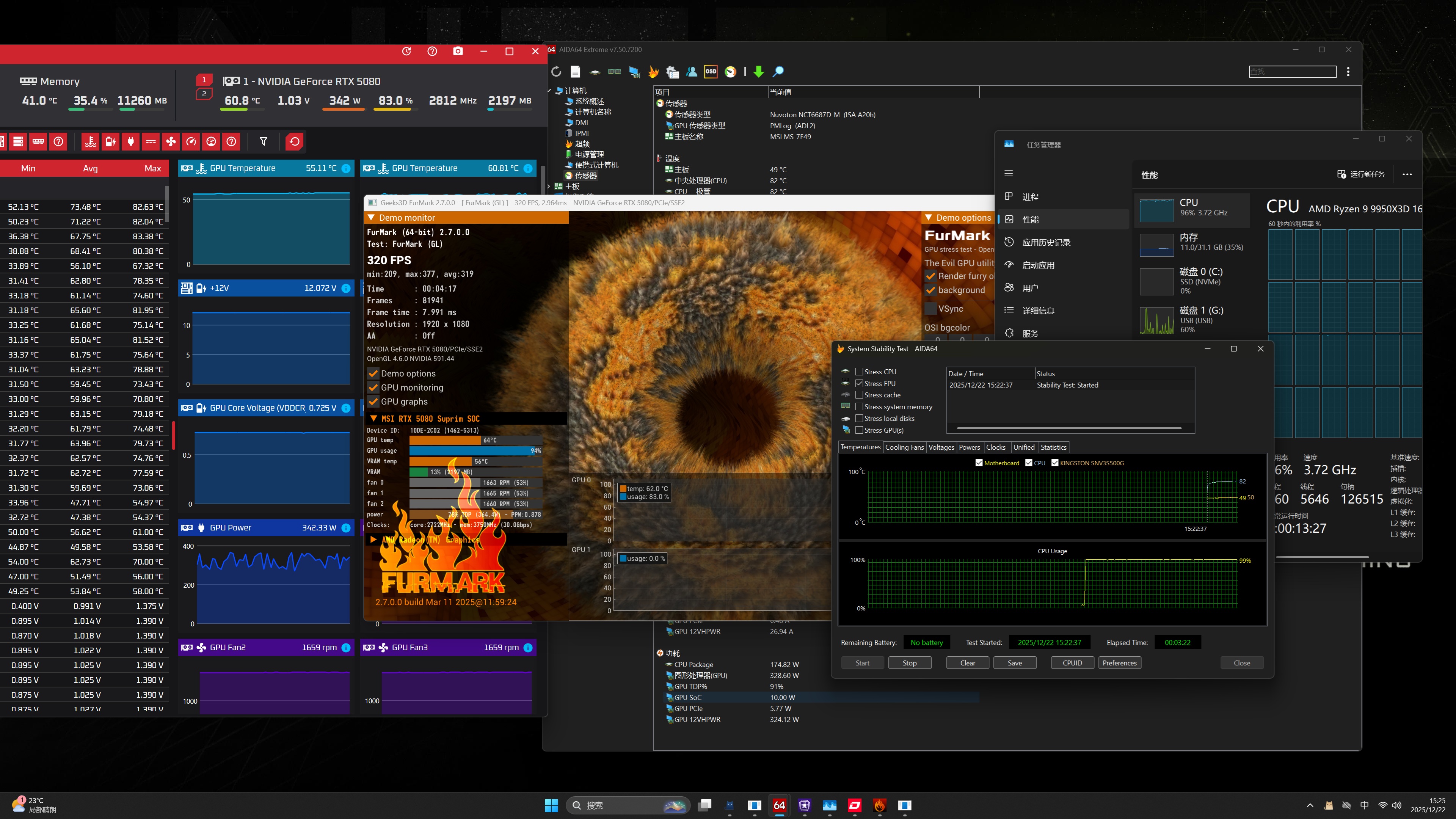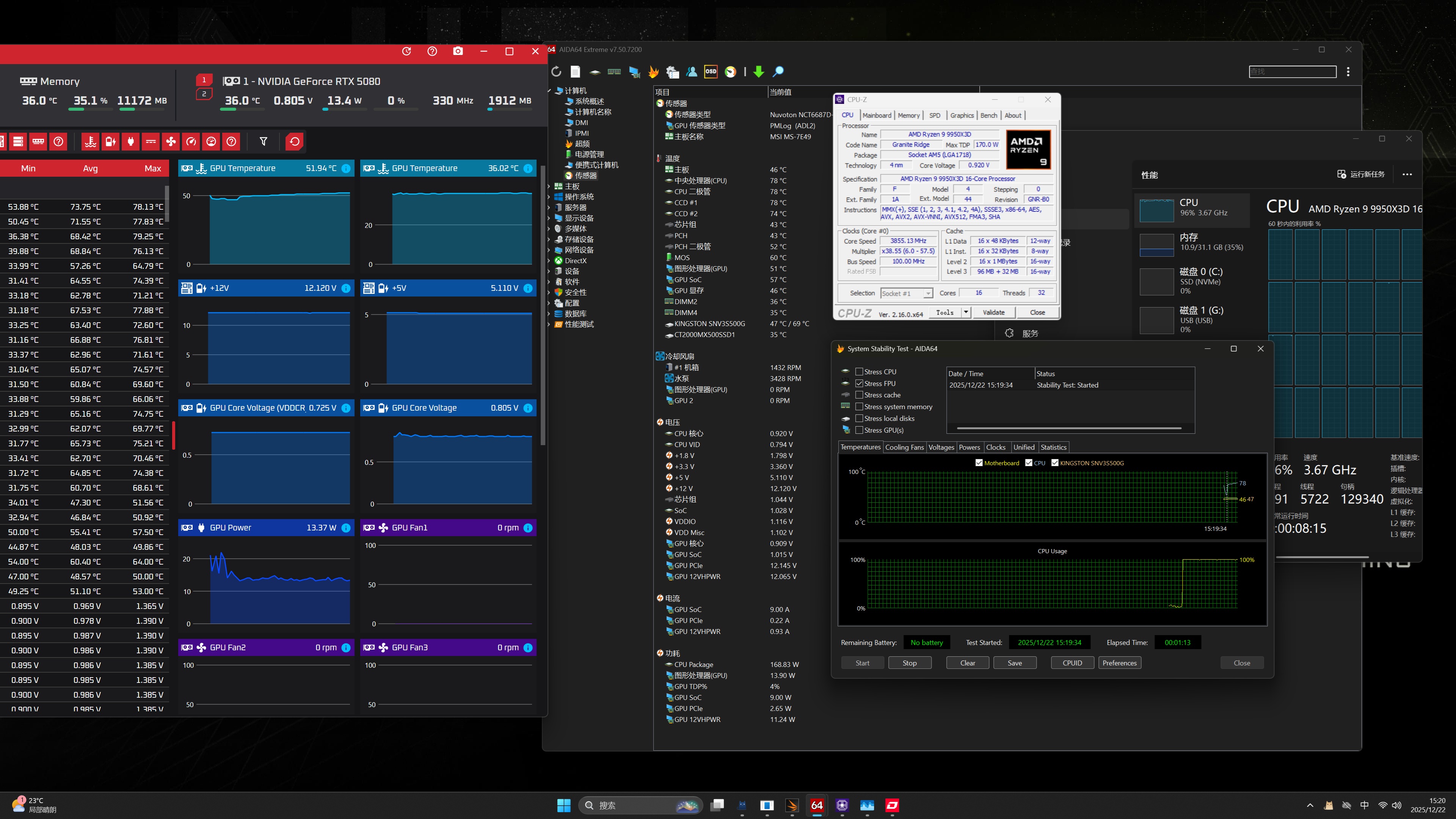 测试平台采用R9 9950X3D+RTX5080,这配置用额定功率850W电源是不错的选择。