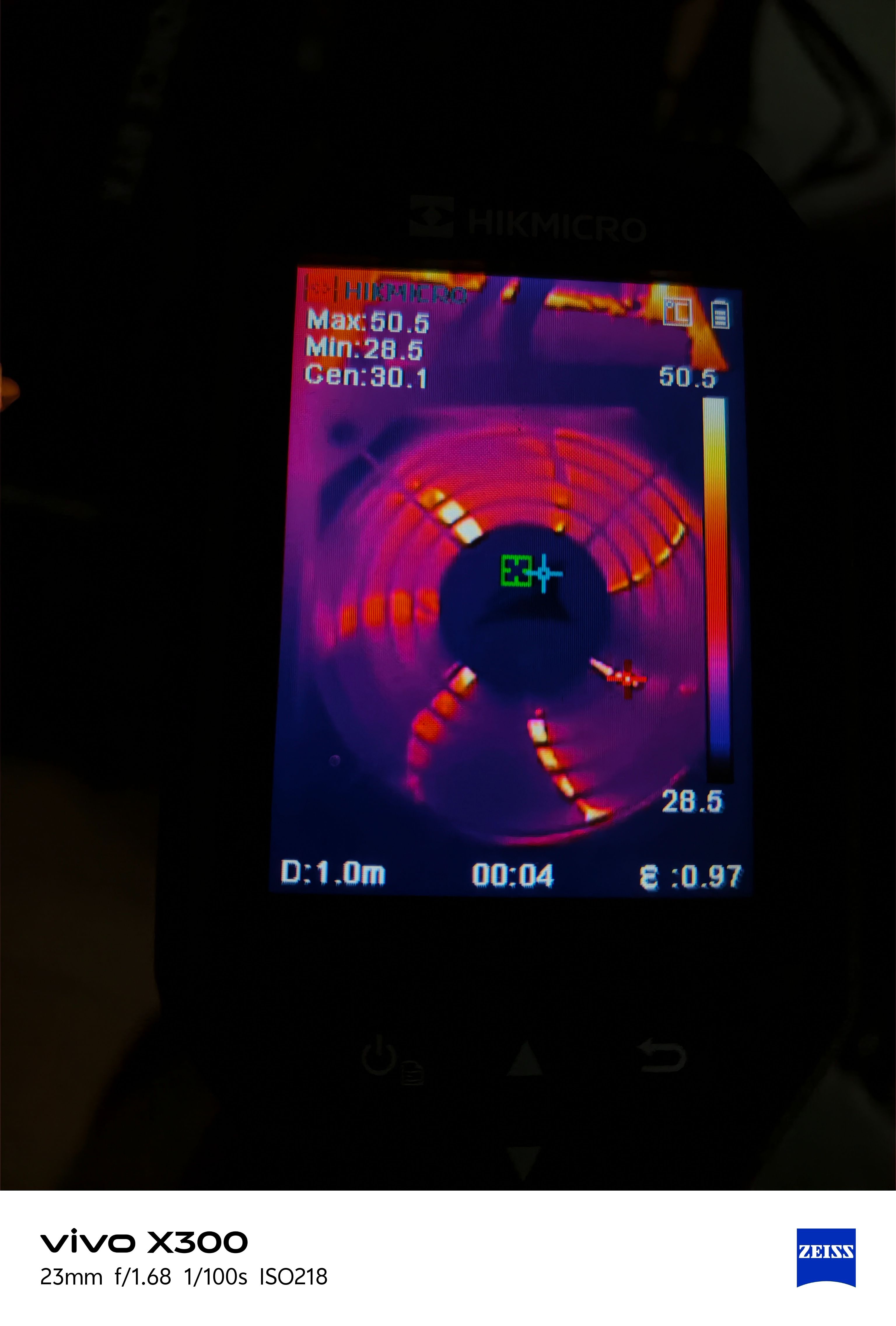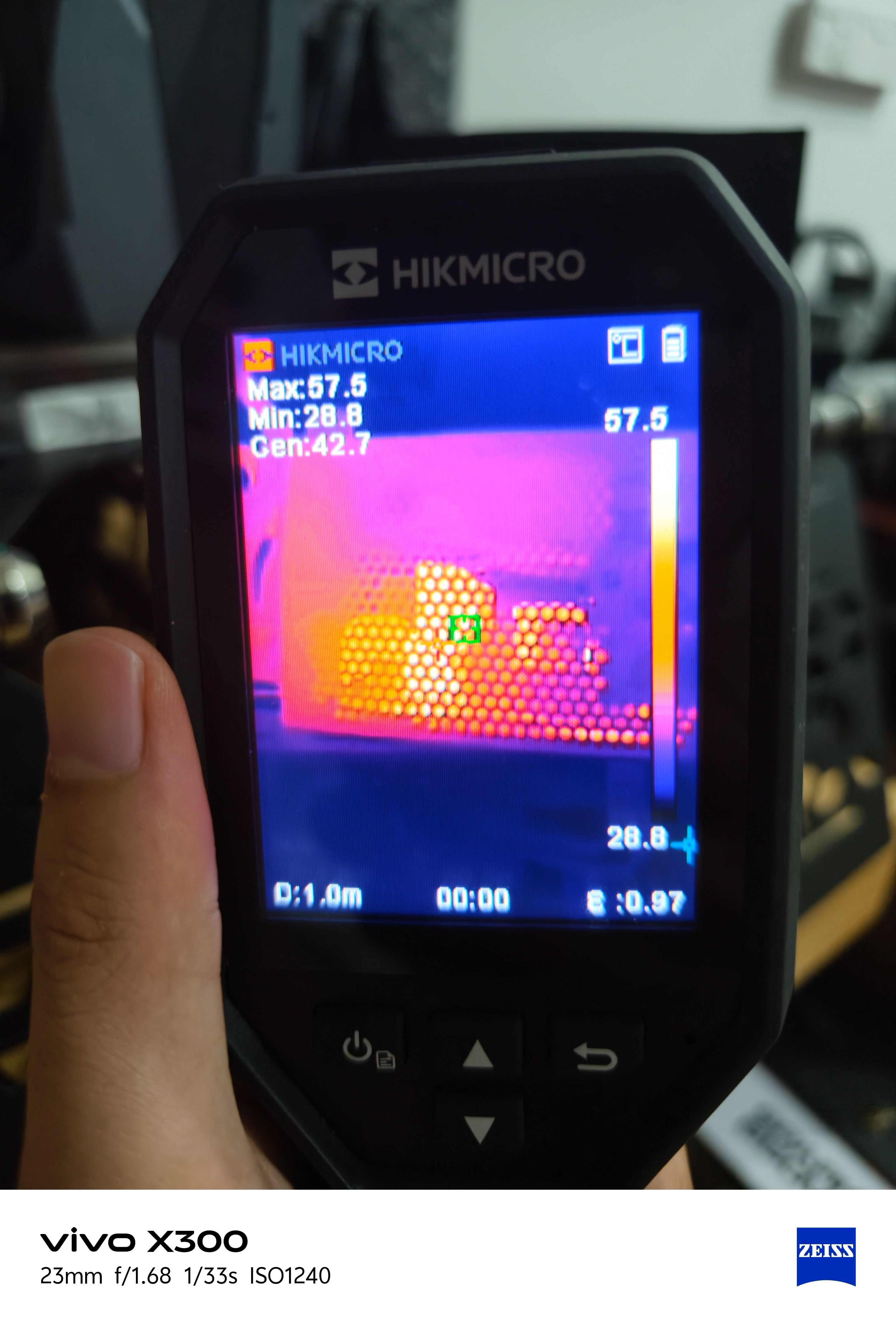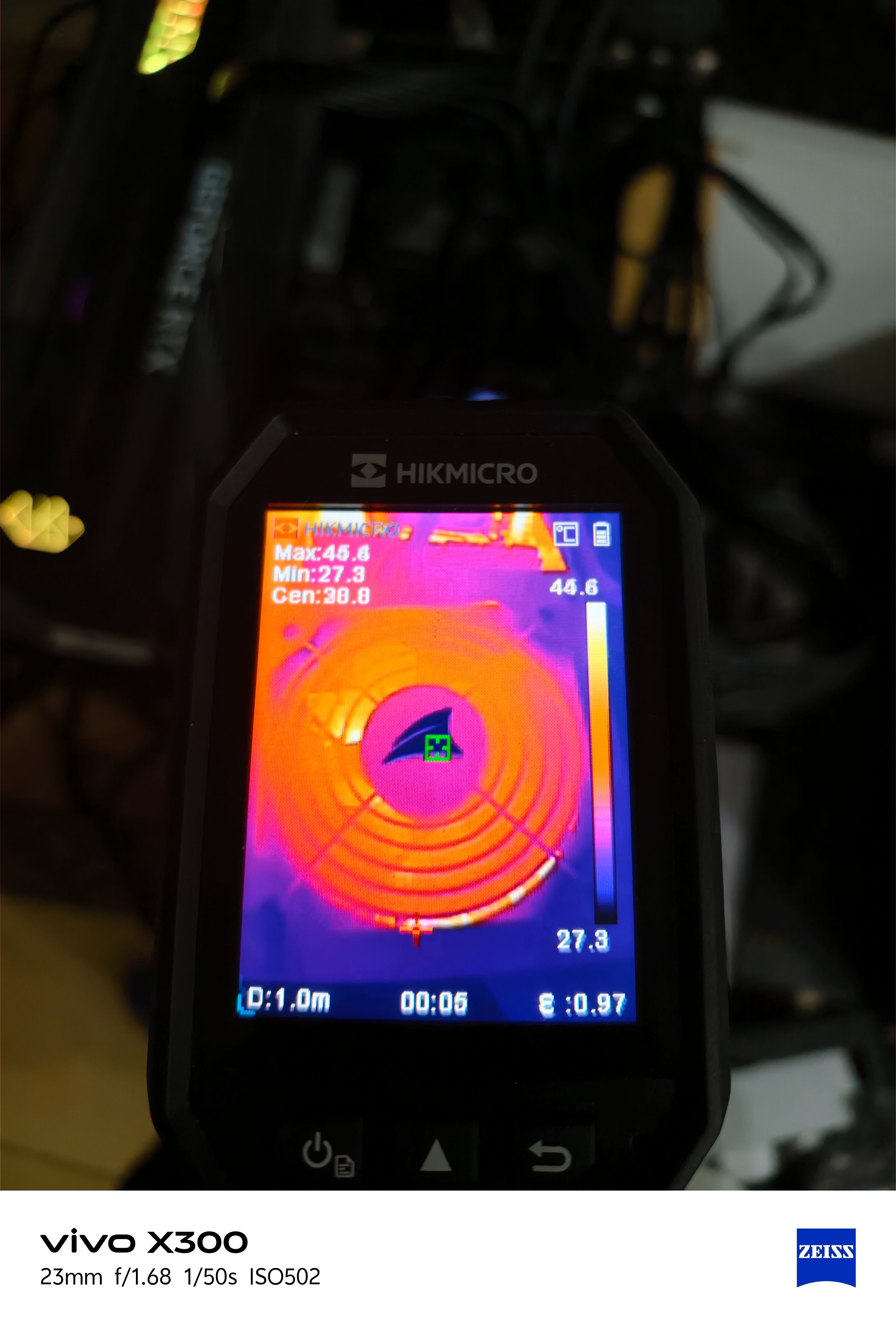 在满载联合烤机状态下,通过海康威视热成像仪对电源内部进行观察,可以看到整体热量分布较为均匀,没有出现明显的局部高温堆积。高发热区域主要集中在功率器件与变压模块附近,最高温度约在55–58℃区间,而风扇区域与外围元件温度明显更低,核心区域温差控制合理。这也从侧面反映出氮化镓方案在高效率、低损耗方面的优势——在接近额定输出的情况下,内部发热被有效压制,散热压力可控,有助于提升整机稳定性与长期可靠性。