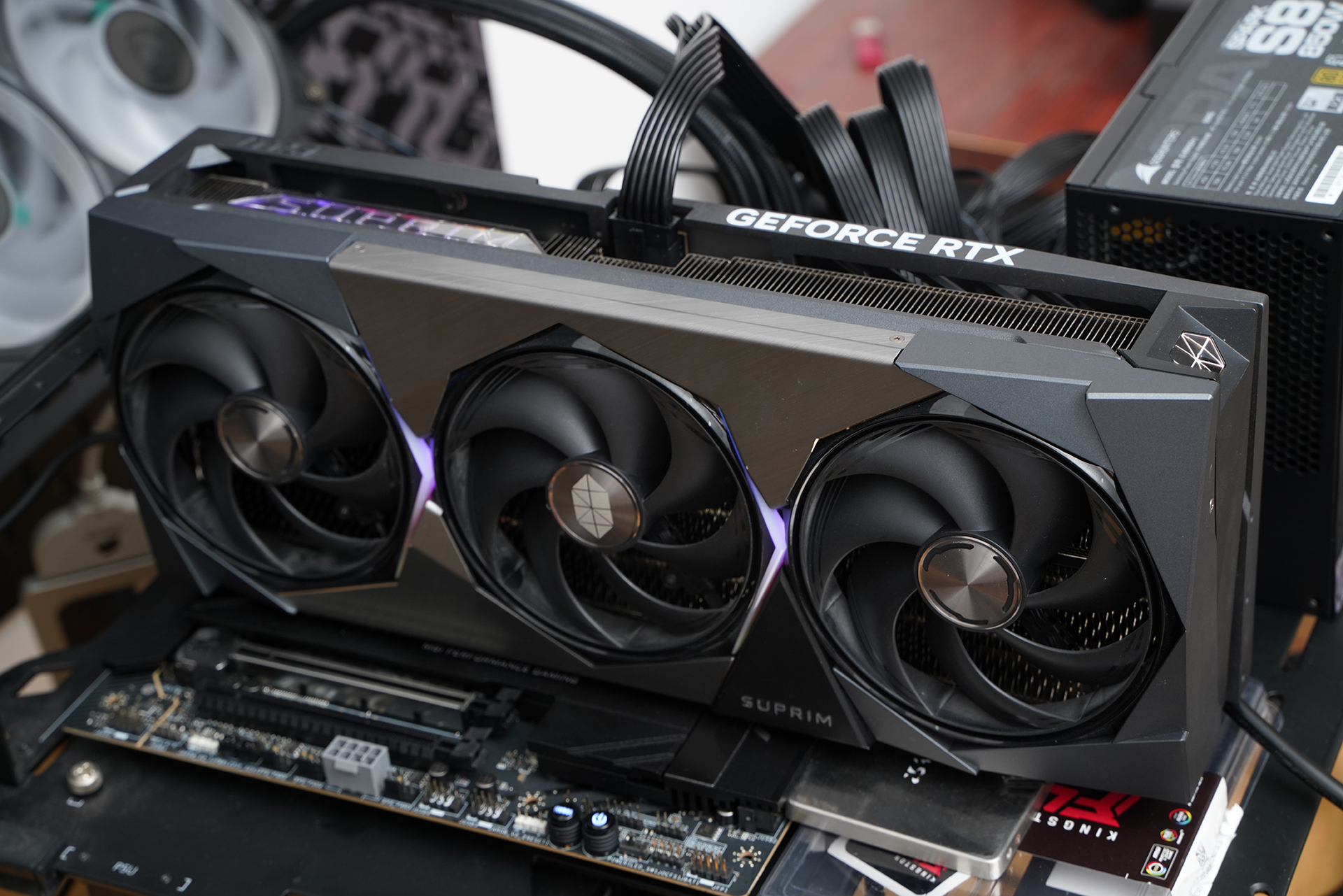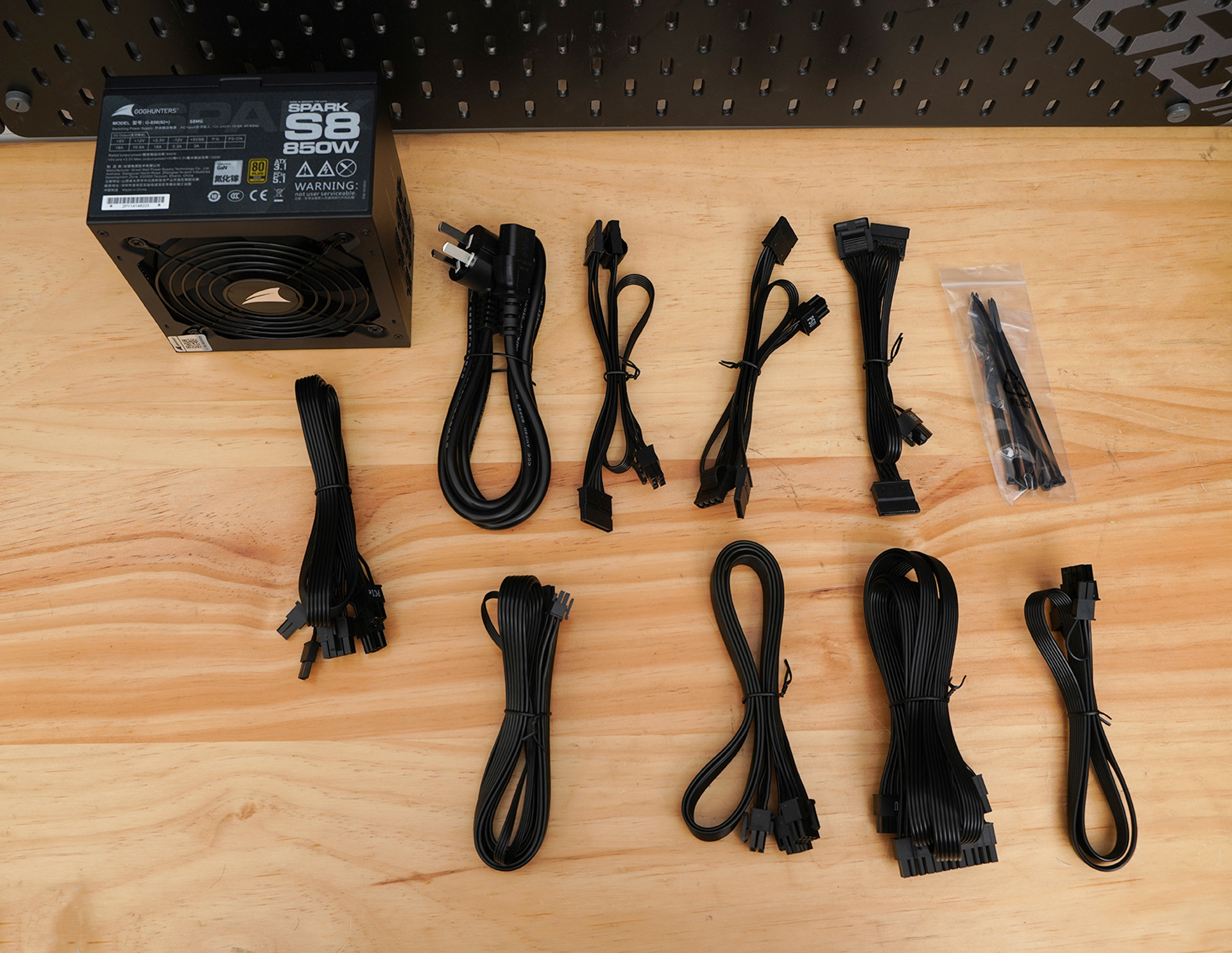 完整附件一览,包含电源本体、电源线以及多组可拆卸模组线材,线材覆盖主板 24Pin、CPU 供电、PCIe 显卡供电与 SATA 等接口,规格齐全,可满足主流及高端平台装机需求;同时附送扎带,配合黑色扁平化线材设计,便于理线与背线整理,整体配置以实用性与装机友好度为主,符合其高功率全模组电源的产品定位。