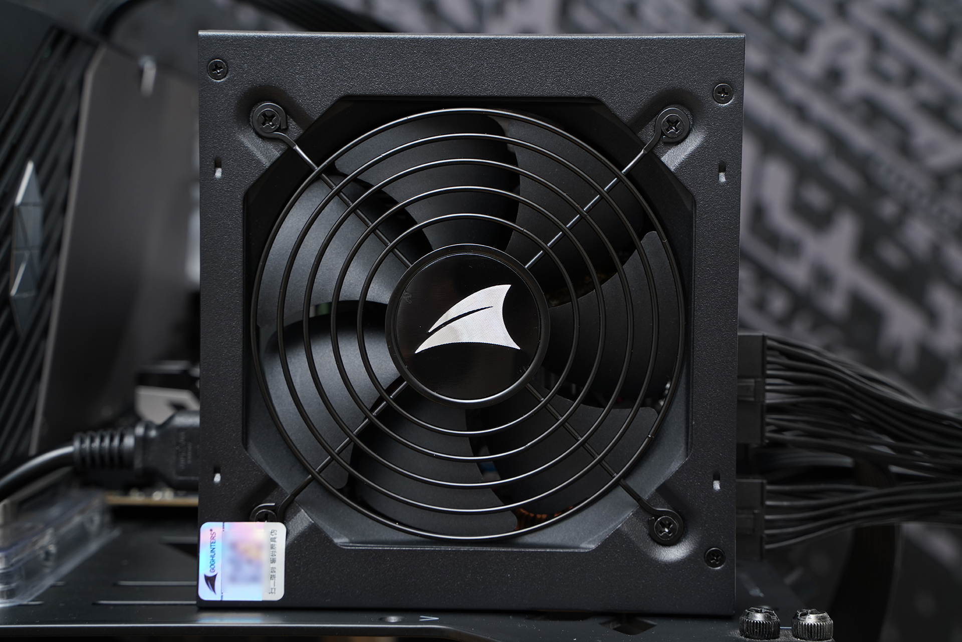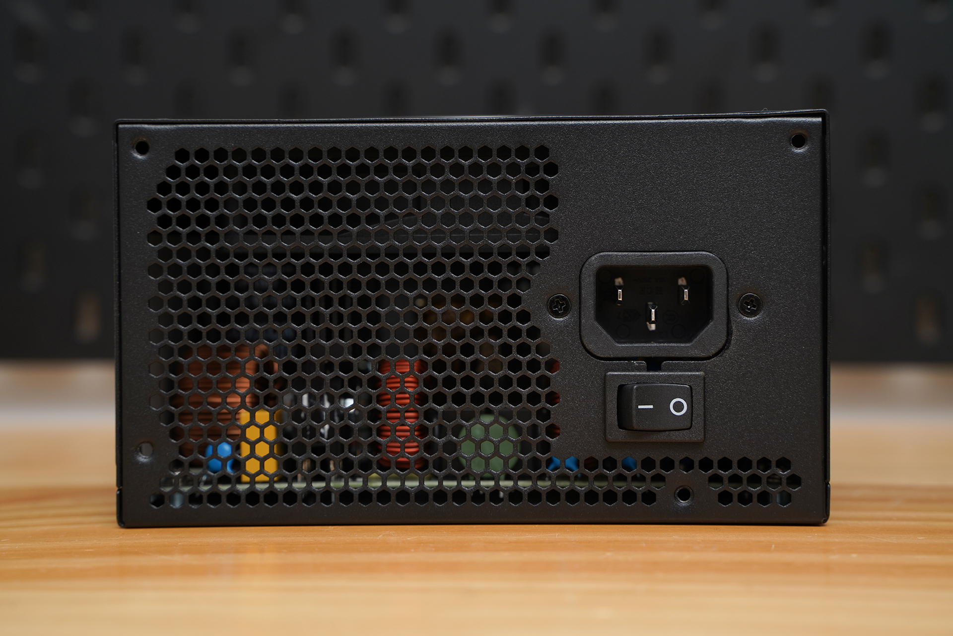 电源尾部采用大面积蜂窝状出风孔设计,有利于热量快速排出,提升整体散热效率;右侧集成AC电源输入接口与独立电源开关,布局规整、操作直观,符合常见 ATX 电源使用习惯。通过出风孔还能隐约看到内部元件分布,整体做工扎实,兼顾散热、安全性与实用性,属于标准且成熟的电源尾部设计方案。