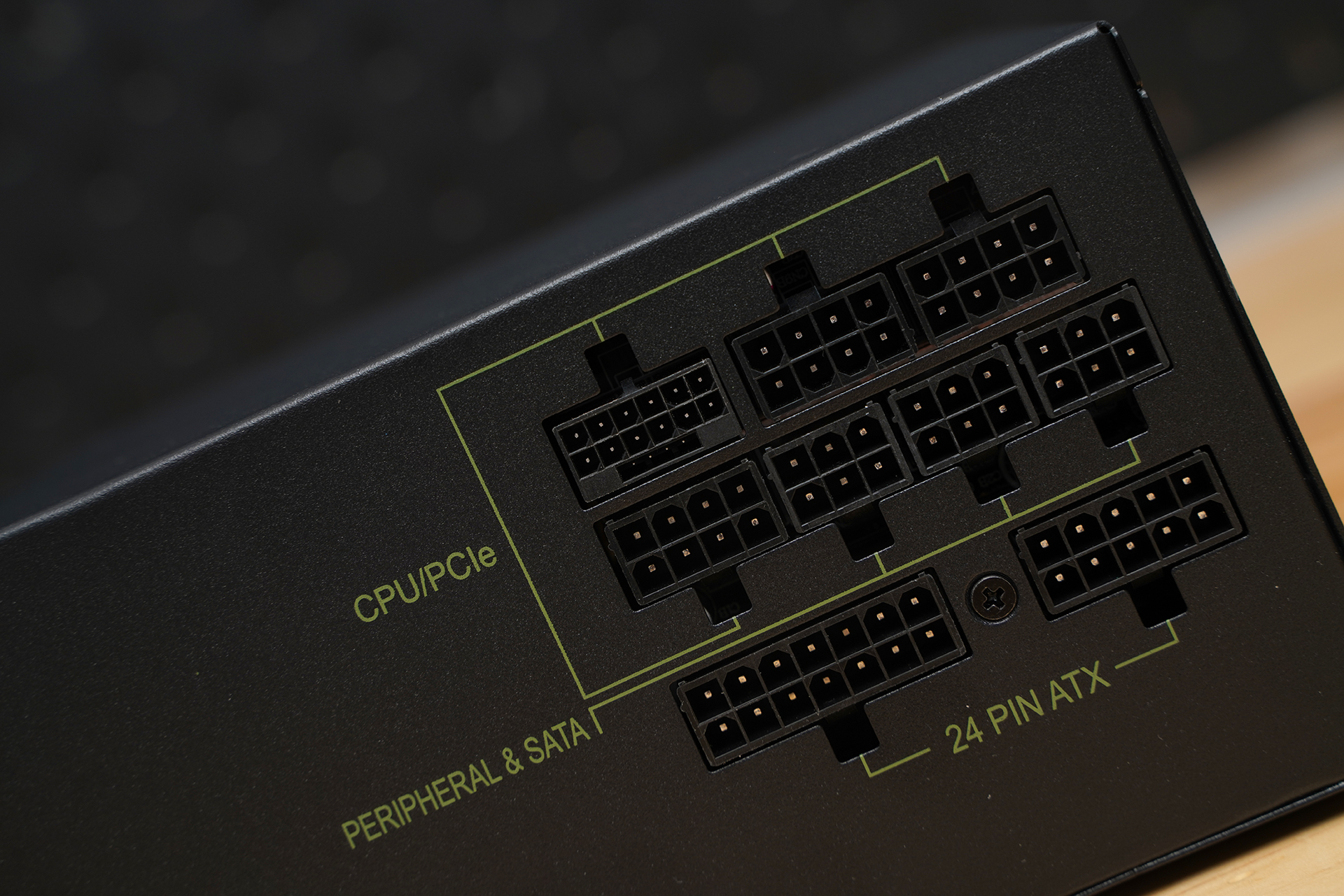 电源采用全模组设计,接口区按 CPU/PCIe、24Pin ATX 以及 Peripheral & SATA 明确划分,布局直观,安装时不易误插;多组 8Pin CPU/PCIe 接口可同时满足高核心数处理器与高功耗显卡的供电需求,配合独立 24Pin 主板供电接口以及数量充足的 SATA/外设接口,整体扩展性符合 ATX 3.1 / PCIe 5.1 平台取向,能够覆盖主流至高性能装机方案的使用需求。