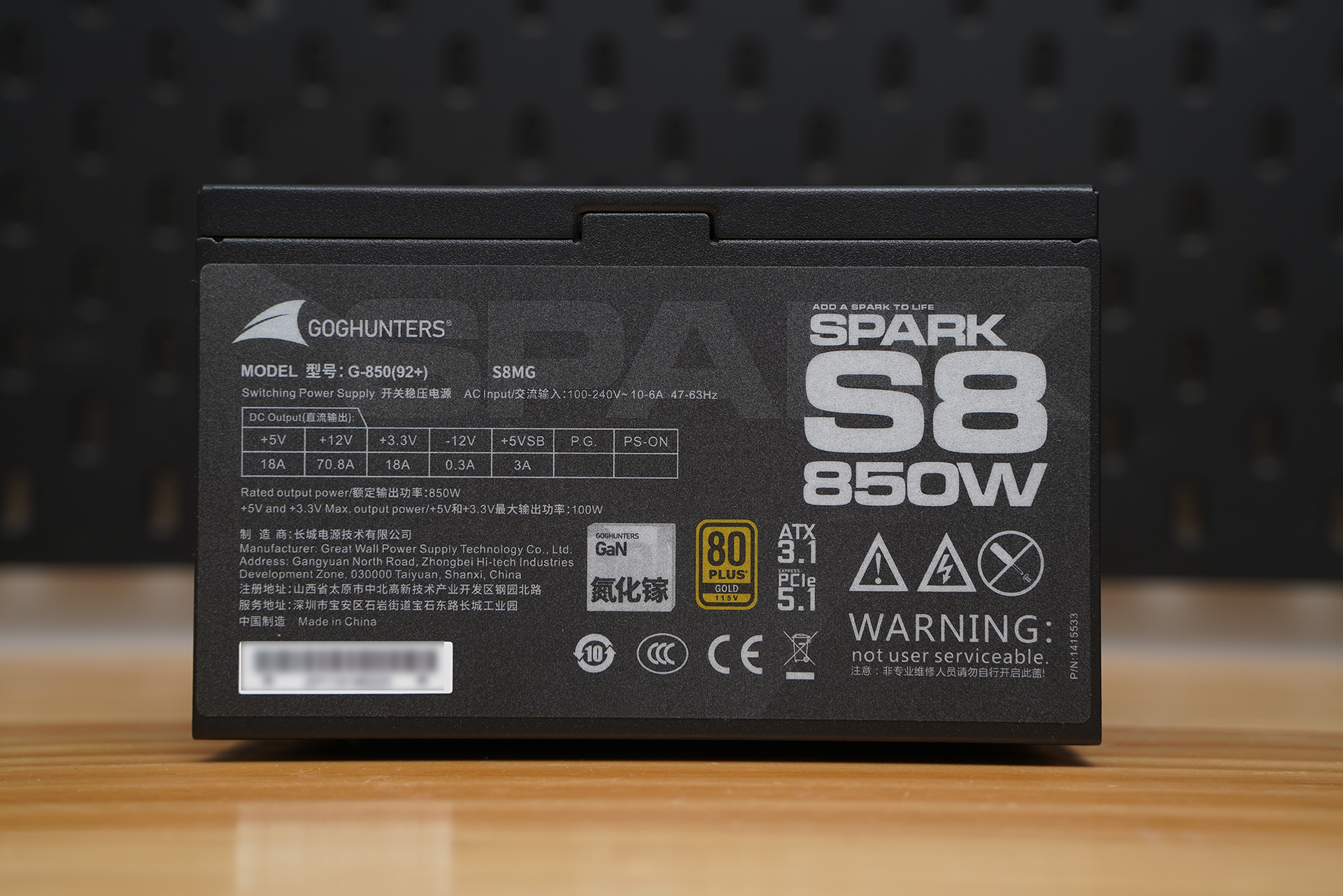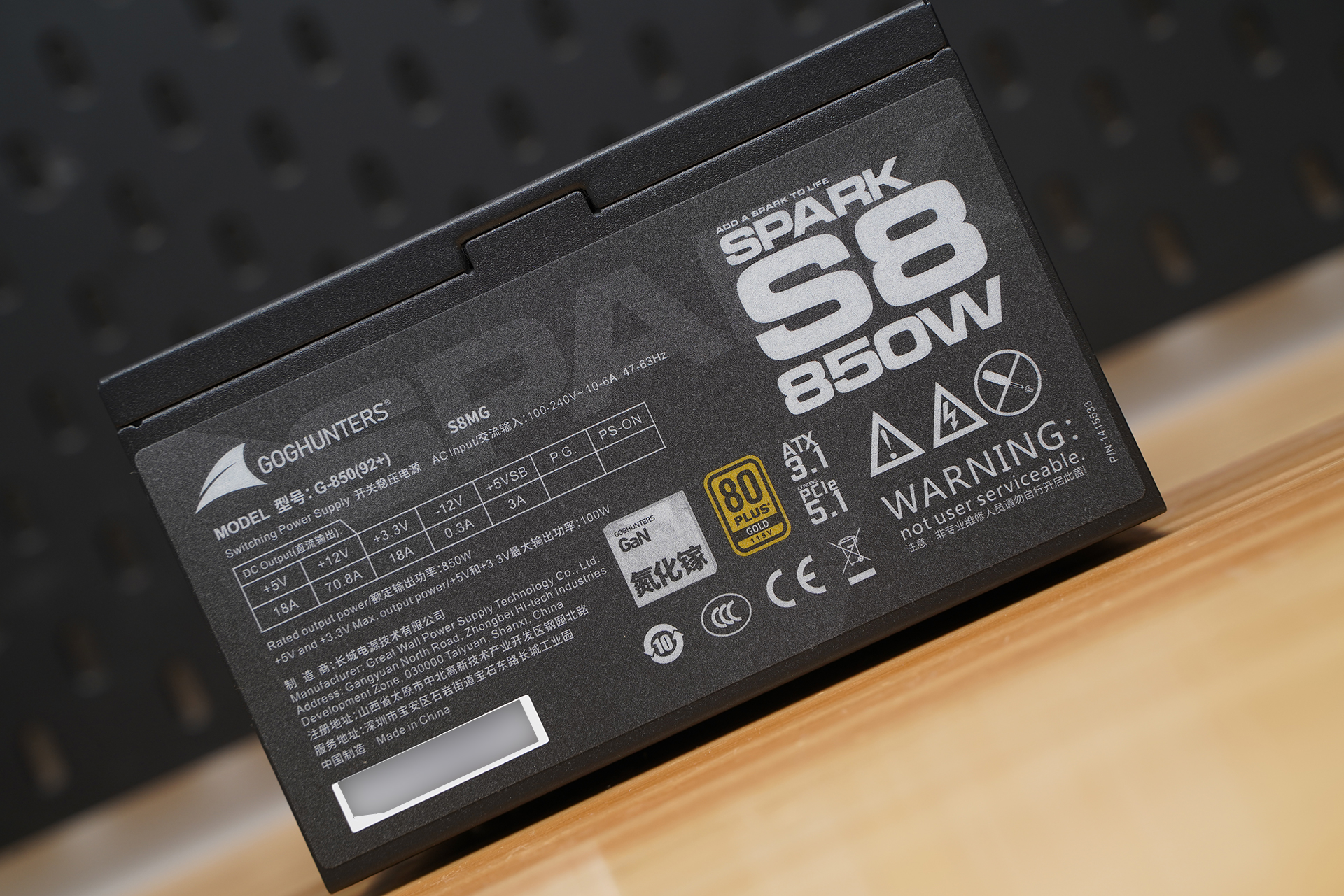 SPARK S8 850W电源本体侧面铭牌。铭牌清晰标注了电源的型号信息、额定功率 850W、各路输出规格,并注明采用GaN氮化镓方案,通过 80 PLUS Gold(金牌)认证等。同时可见完整的安规与认证标识,以及“不可自行拆解”的安全提示.