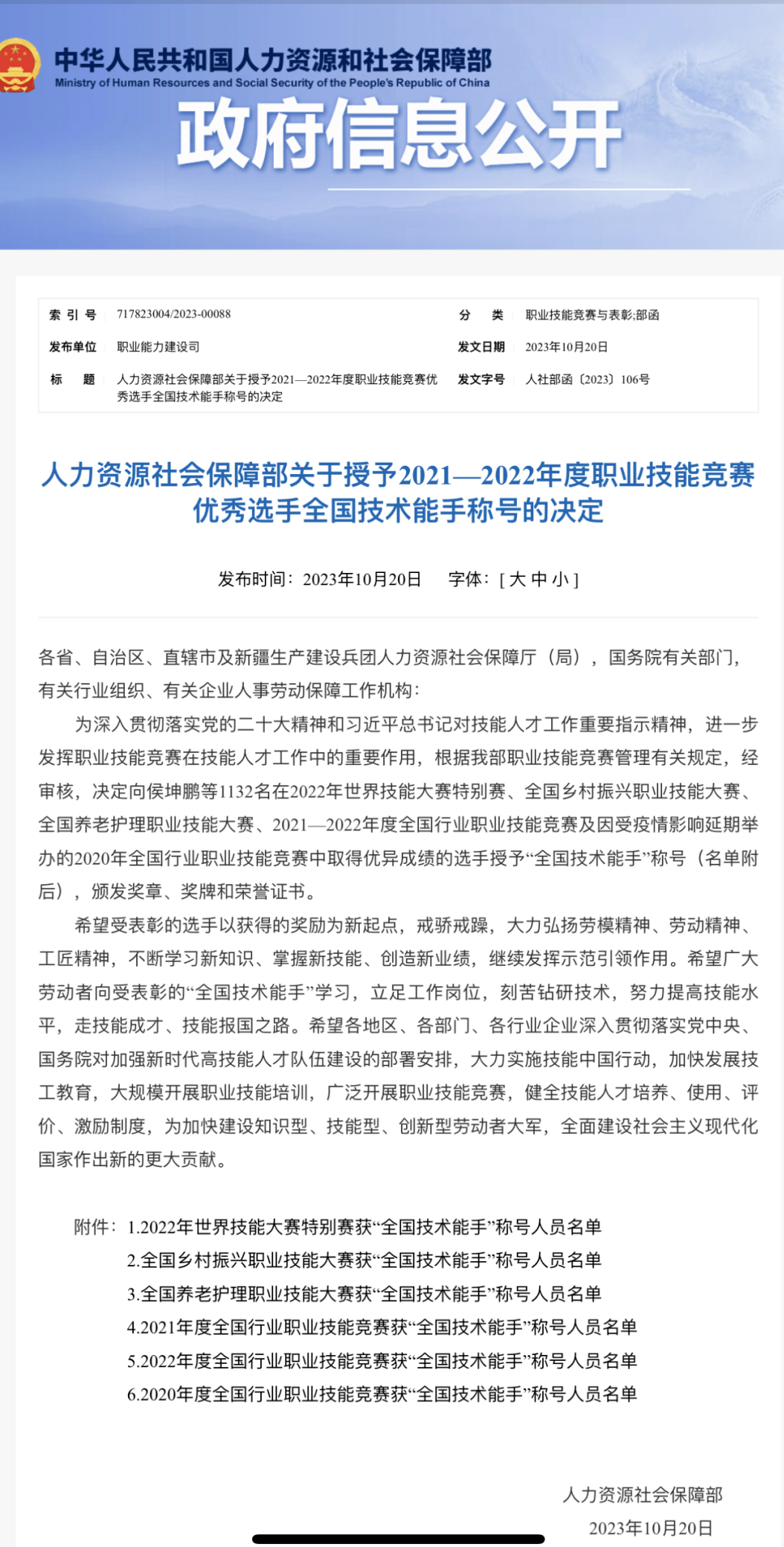 为深入贯彻落实党的二十大精神和习近平总书记对技能人才工作重要指示精神,进一步发挥职业技能竞赛在技能人才工作中的重要作用,《人力资源社会保障部关于授予2021—2022年度职业技能竞赛优秀选手全国技术能手称号的决定》(人社部函〔2023〕106号)