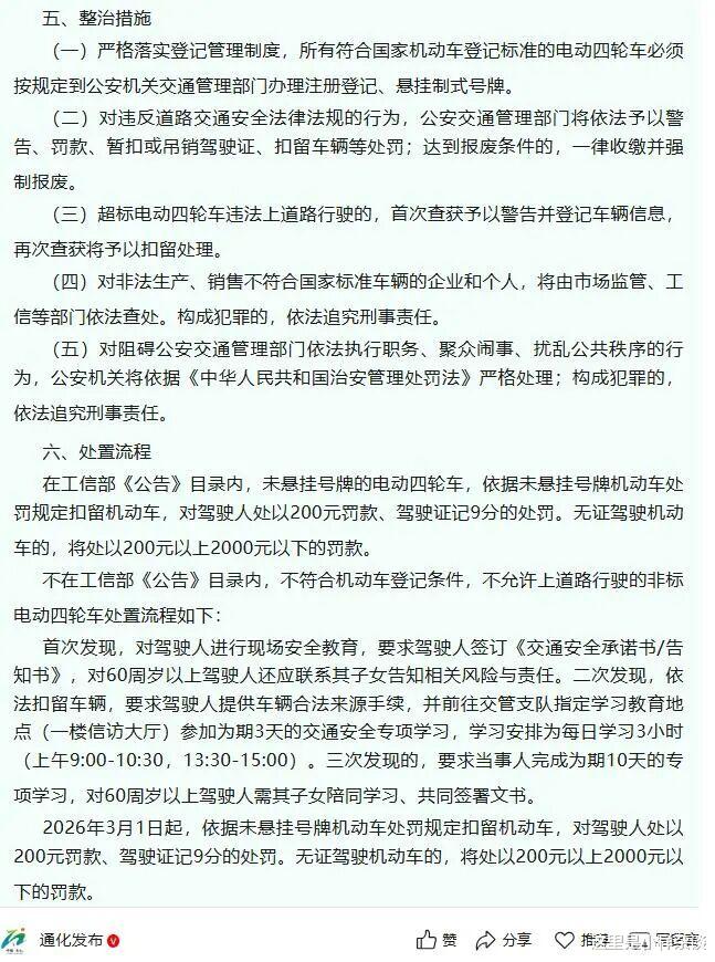 其中提到通化市将坚决杜绝非标电动四轮车违法上路行驶,驾驶电动四轮车酒驾醉驾、违法载人、超员载客、闯红灯、逆行、追逐竞驶、飙车炸街、随意穿插抢行、不按规定靠右侧(或辅道)行驶的行为将被处罚。2026年3月前,只是宣传引导,对于违法行为只是劝导。而3月后,对于违法行为就将依法处罚了,而且处罚措施还是非常严格的。