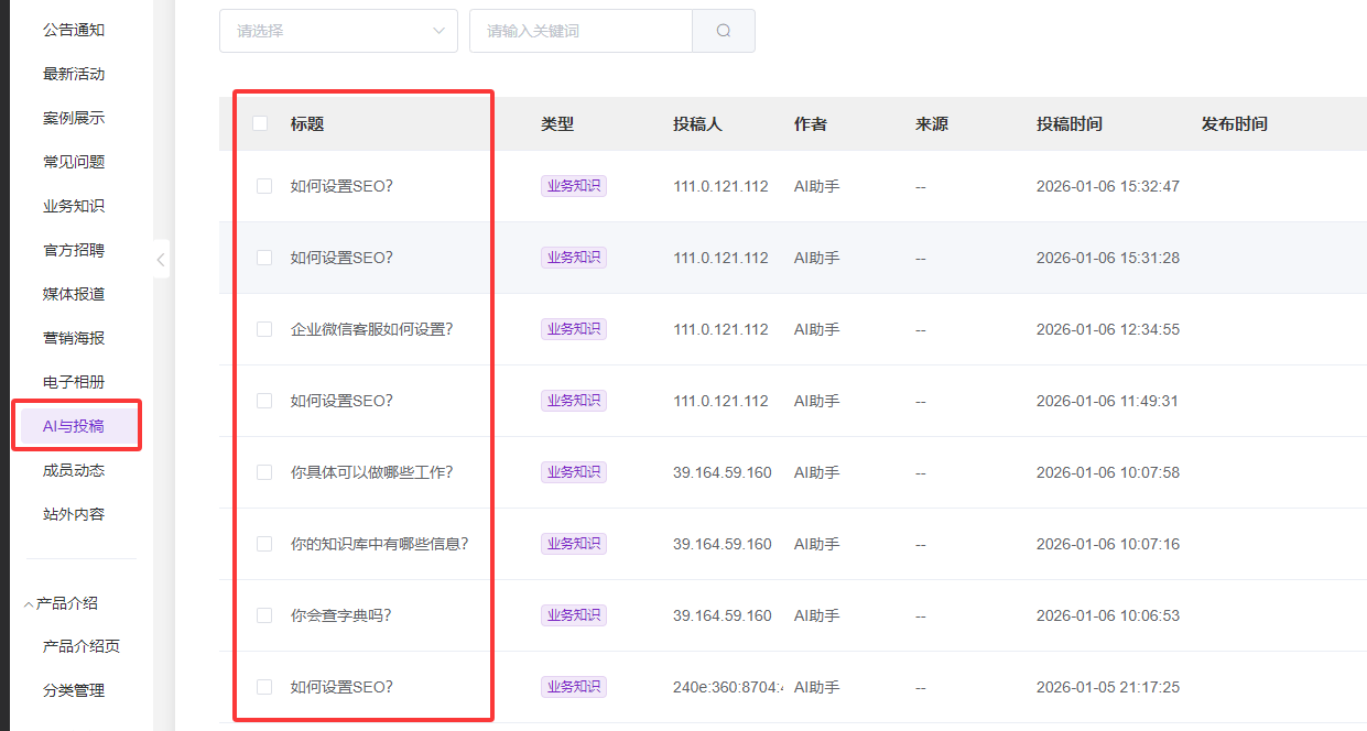企业官网的 AI 智能体,正是捕捉用户需求的核心入口 —— 它每天都会接收大量来自潜在客户、现有用户的咨询,这些问题直接反映了目标群体的核心困惑、实际需求和关注重点。而营销枢纽系统后台的【AI 与投稿】功能,恰好为这些咨询数据提供了沉淀的渠道:该功能会完整记录所有客户咨询的问题,从高频重复的业务疑问到个性化的功能咨询,都能被精准捕捉。而企业需要做的就是将该功能开启即可。