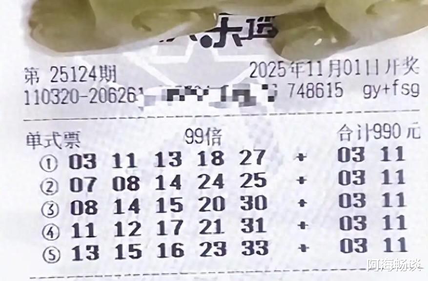 首先这张99倍票是江苏99哥的票面,前区号码各异,不过热门号码还是比较多些。后区则选择了03和11的全奇数组合,正好是上期后区4和10的相邻号。这样一套融合多期热号的思路,你认为它有机会中奖吗?