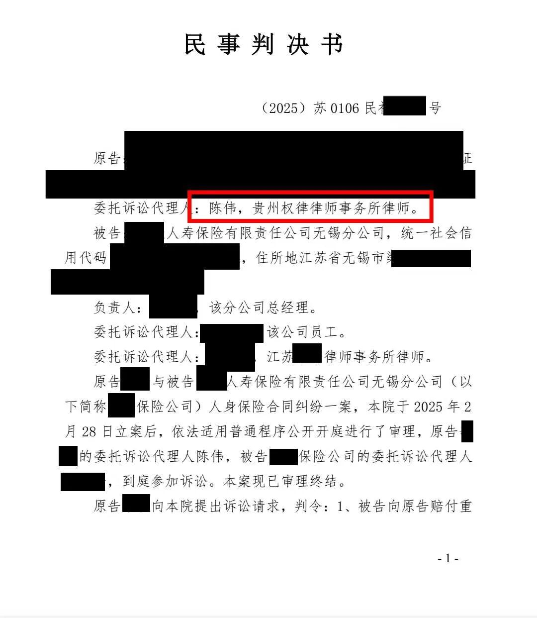 南京市鼓楼区人民法院经审理,完全采纳陈伟律师的代理意见,认定原告所患疾病属于保险合同约定的重大疾病范围。