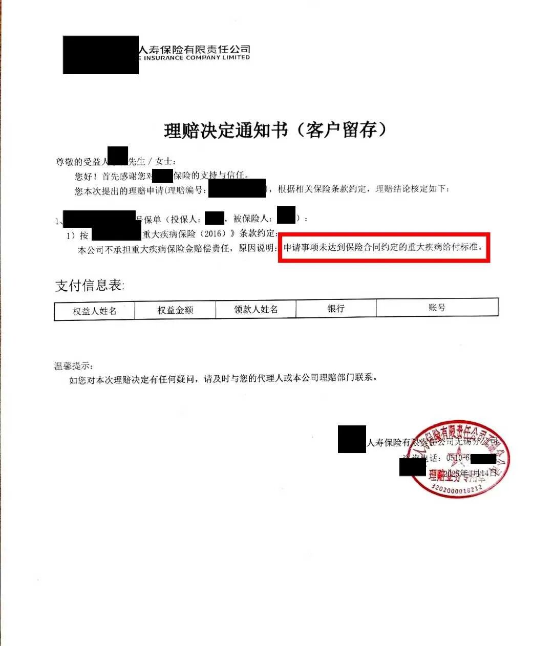 原告向保险公司申请理赔后,保险公司出具《理赔决定通知书》,以“申请事项未达到保险合同约定的重大疾病给付标准”为由拒绝承担保险金赔偿责任。原告遂委托陈伟律师向南京市鼓楼区人民法院提起诉讼,要求保险公司依约赔付。