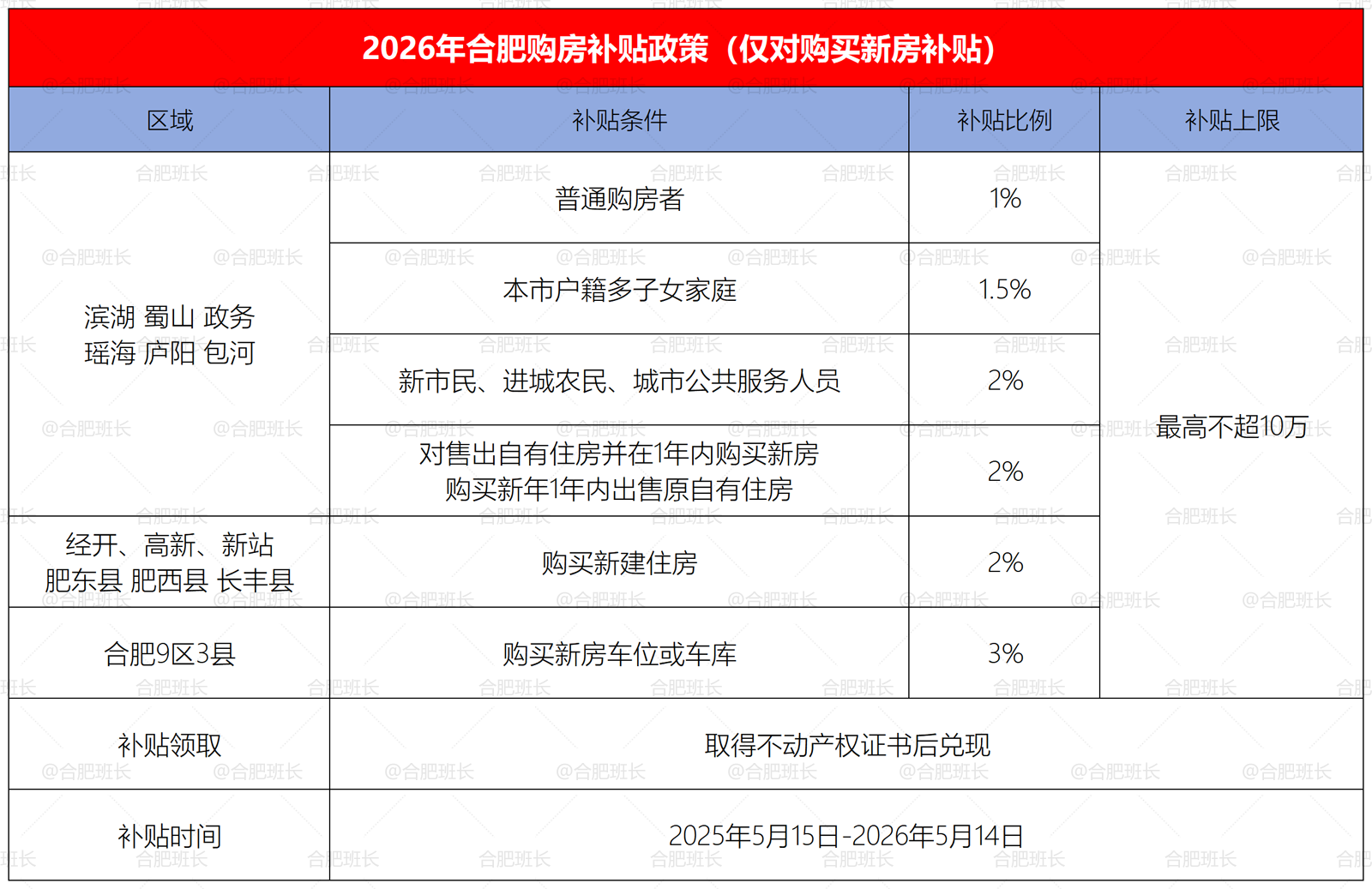 目前合肥购房补贴只针对购买新房,时间截止2026年5月14日,是否延期还没有明确政策;