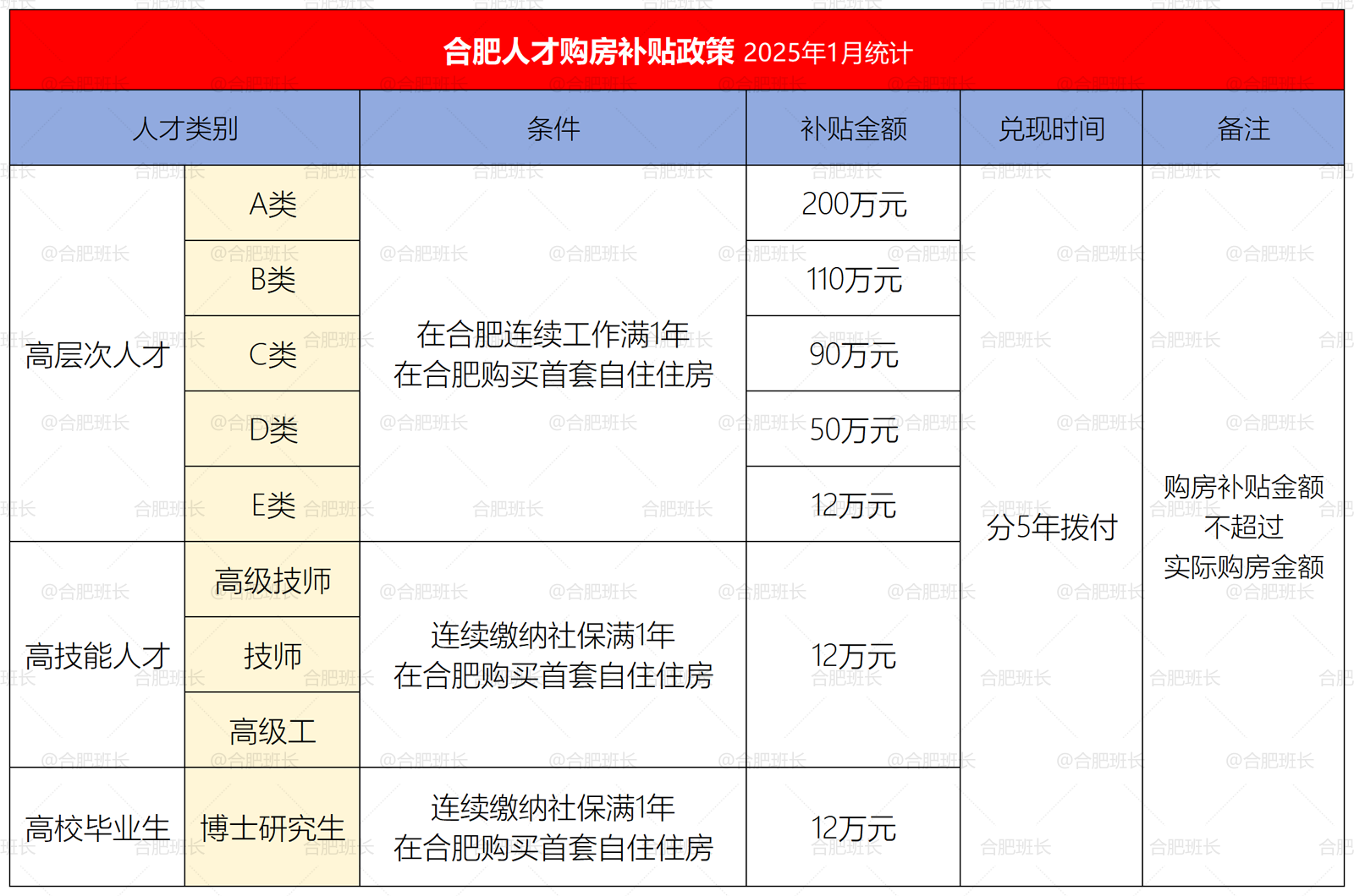 对在合肥连续工作满1年的A、B、C、D、E类人才,购买首套自住住房,可分别按最高200万元、110万元、90万元、50万元、12万元的标准发放购房补贴;高级技师可按最高12万元标准发放购房补贴;博士研究生可按最高12万元标准发放购房补贴。
