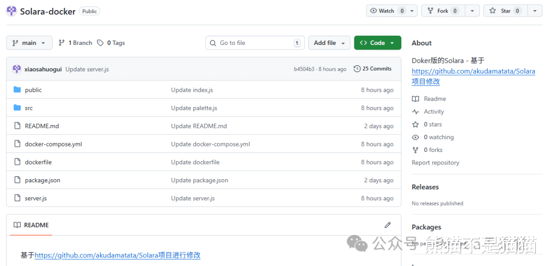项目部署作者提供了完整的Dockerfile文件以及compose文件,但并没有提供构建好的镜像,所以熊猫这里也是借花献佛,将构建好的镜像上传到了ghcr.io上,你可以通过docker pull ghcr.io/panda-995/solara-music:latest来拉取镜像,同时也可以通过compose进行一键部署。