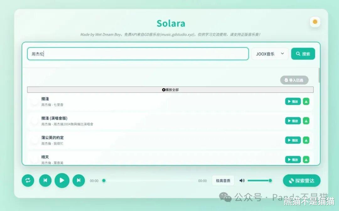 主页清新,支持多解析源切换。可播放、下载(含无损),在线播放观感佳,带探索雷达功能。非常不错的项目,不过切记项目仅供学习交流。