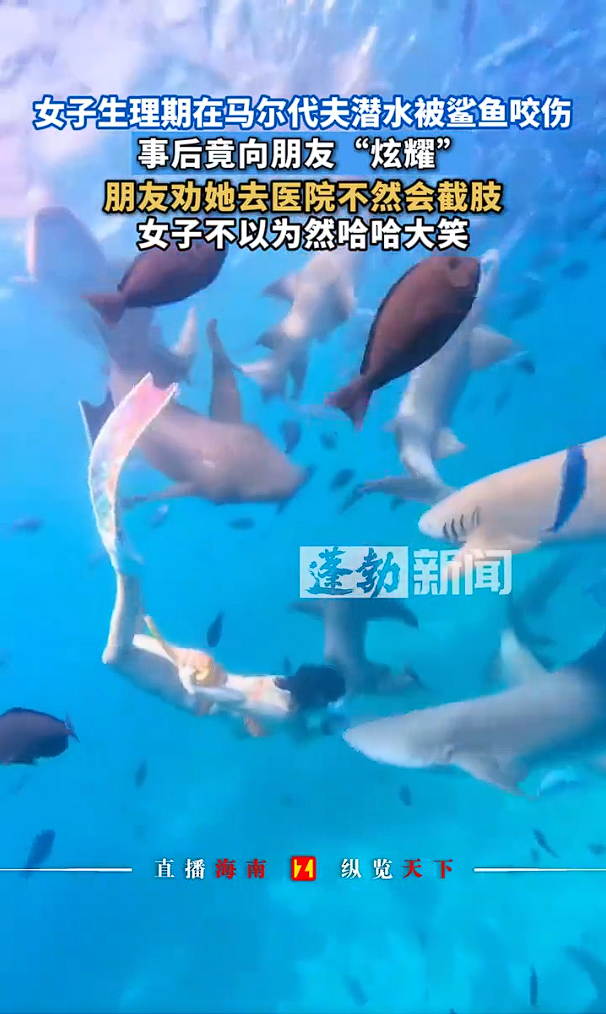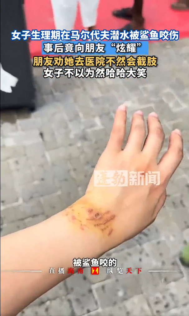 2025年11月21日,中国游客小雨在马尔代夫参加当地出海团(65美元/人),在第四次下水和护士鲨群共游时,一条鲨鱼突然咬住其右手腕。伤口呈开放性圆形,约绿豆大小,伴有渗血和划痕。尽管当时未觉剧痛,但上岸后伤口青紫肿胀,朋友紧急劝其就医。小雨延迟至当晚才注射破伤风并简单清创,随后竟包扎纱布继续下水拍照,甚至不慎踩中海胆,导致二次感染风险加剧。