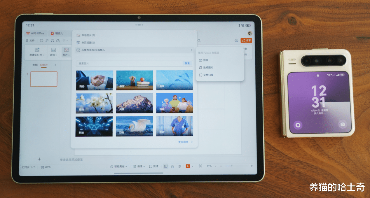 比如我们熟悉的办公软件WPS Office编辑文档时,可以看到MatePad 11.5 S上的WPS Office拥有桌面端相同的布局而且支持文档窗口自由缩放与多比例分屏,处理表格、数据的能力大幅增强,它还支持跨设备应用,比如我可以在写PPT时直接插入我Pura X手机上的图片。