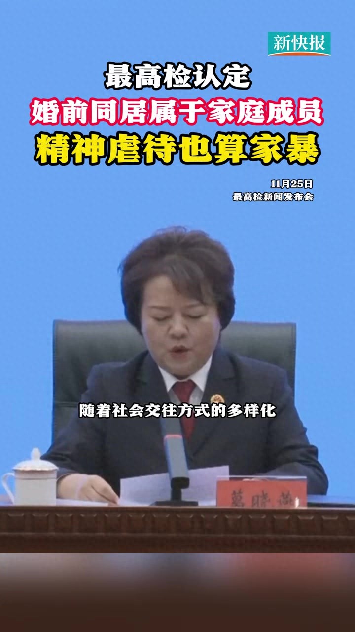 11月25日,最高检召开的新闻发布会上,最高检党组成员、副检察长、全国妇联副主席葛晓燕介绍,随着社会交往方式的多样化,检察机关依据刑法、反家庭暴力法等法律规定精神,将具有共同生活基础事实的婚前同居关系认定属于家庭成员关系,并将家庭成员身体伤害以外的精神虐待认定为家庭暴力行为,对受害者的保护更加立体全面。