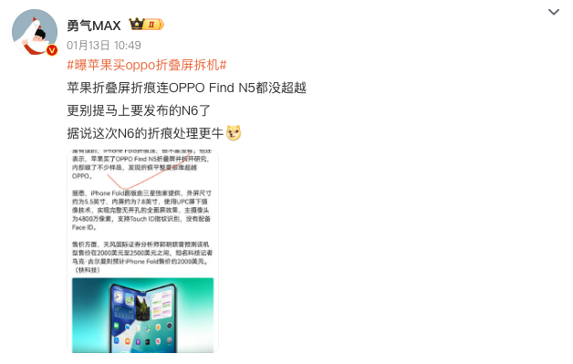 折痕控制也是同理,OPPO Find N5已经做得很好,有可靠消息说苹果买了OPPO Find N5折叠屏拆开研究,内部做了不少样品,发现折痕平整很难超过OPPO折叠。所以追求无折痕的话,感觉等OPPO Find N6会比iPhone Fold更靠谱,前者还大概率先发布。