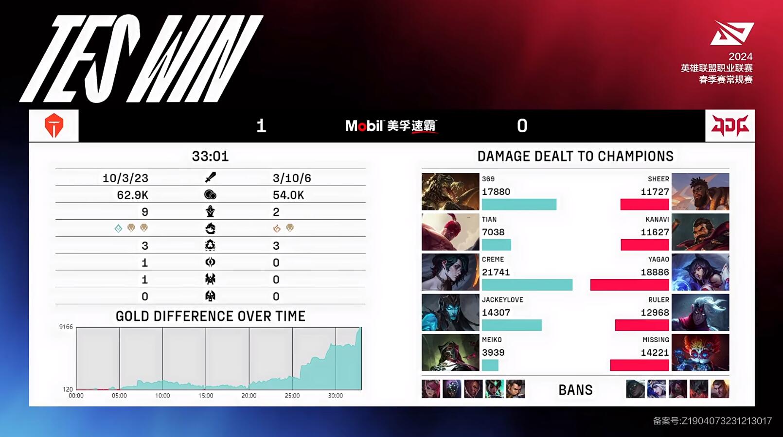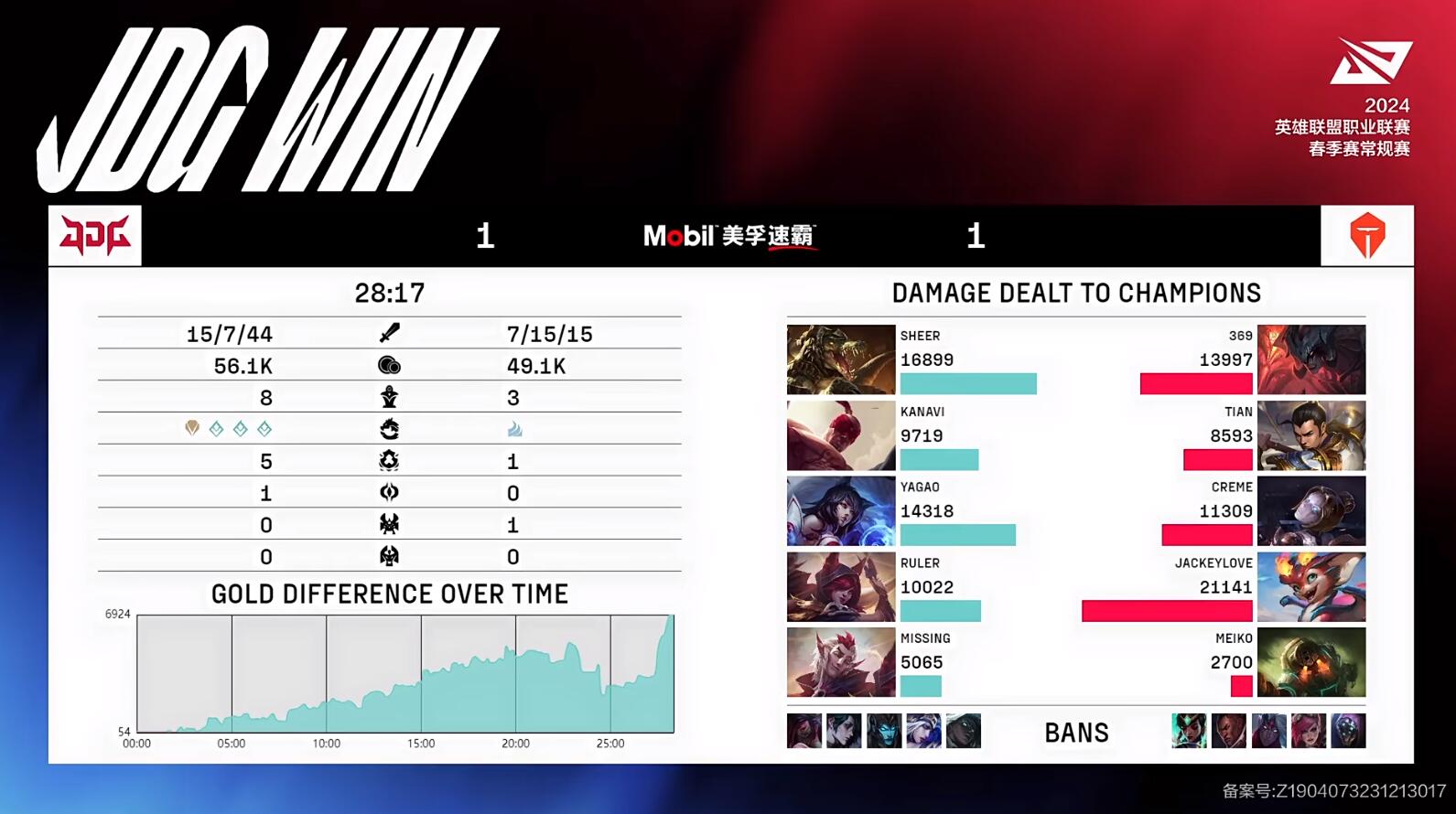 赛后数据,两边全场也就打了三波团战结束游戏,JDG阵容前期压制没打出来,中期没啥主动性,虽然能够咬住经济,但是打起团来确实有点没说法。