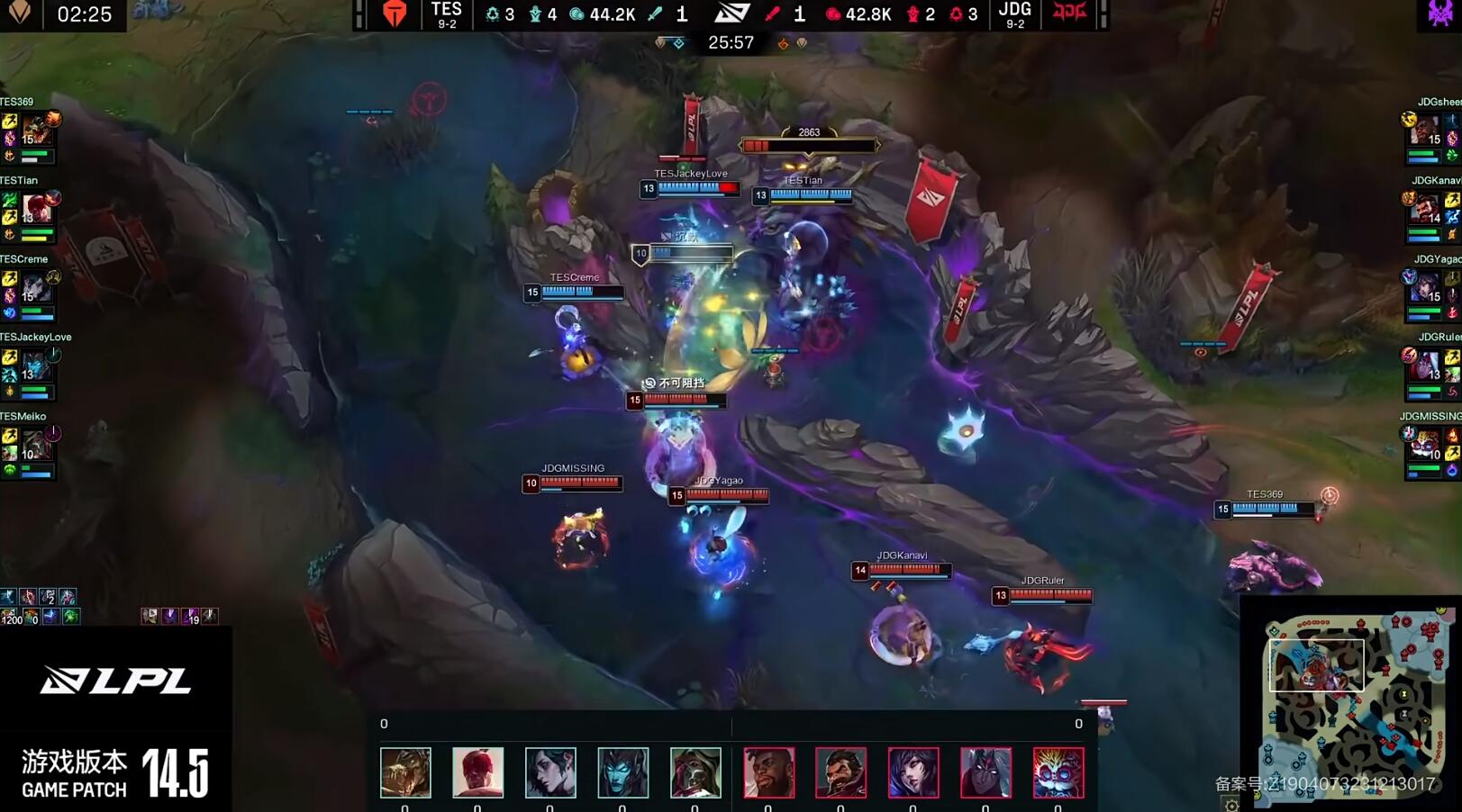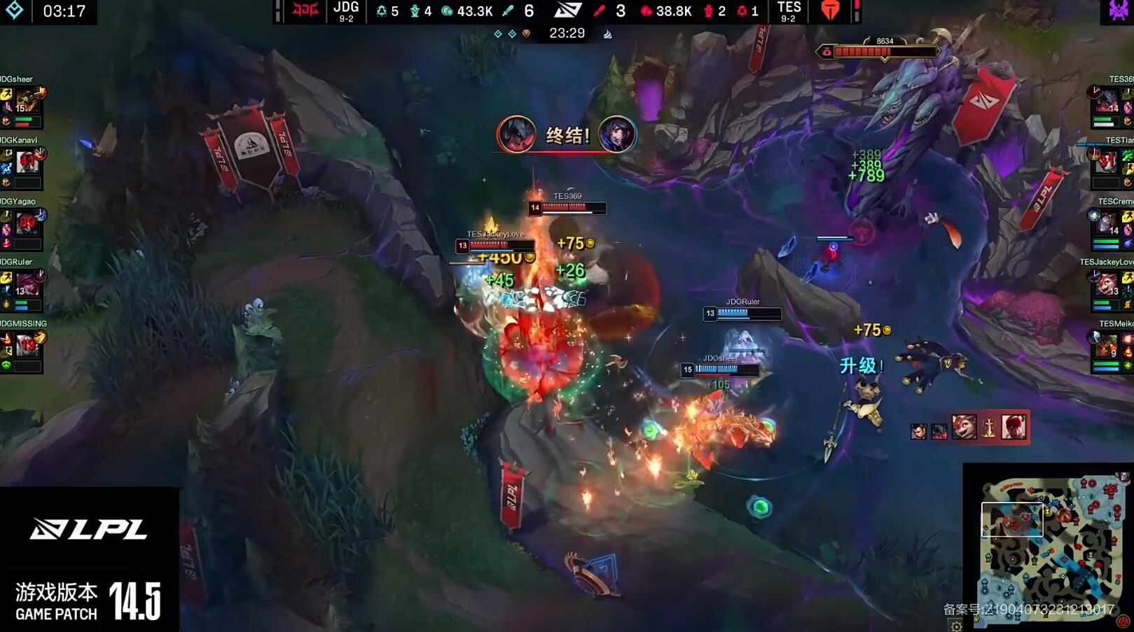 TES赢团后选择强打大龙,虽然Tian稳稳惩下大龙,但团战JDG取得1换3,对于TES来说还是赚的,毕竟断掉了JDG最重要的提节奏点,JKL小火龙也在连续的接团中吃到了多个人头,经济差也被TES缩小到了只差3K。
