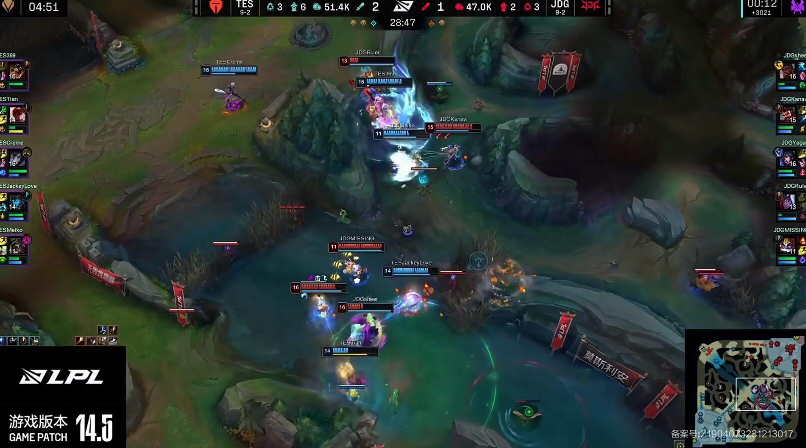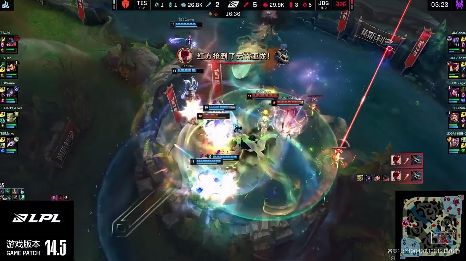 16分钟小龙团,TES选择进龙坑Rush小龙,但Kanavi盲僧进场成功抢下小龙,Yagao妮蔻也在龙坑中大招坐住多人,JDG打出0换5的完美团,基本锁定胜局。