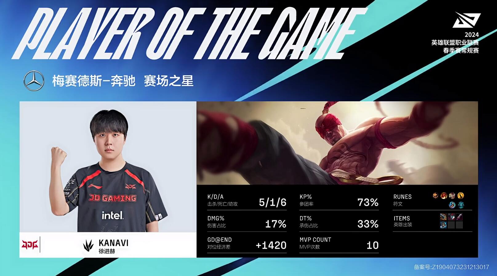 MVP给到了Kanavi的盲僧,赛季第十次MVP,追平了FPX打野选手银河。