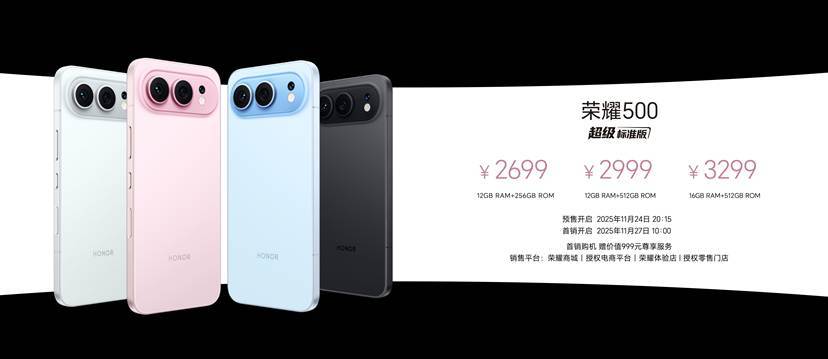 11月24日,荣耀500系列在杭州正式发布,该产品系列在“影像、性能、续航、外观、体验”等方面实现全维升级突破,重塑档位标准。荣耀500系列共两个版本,分别为荣耀500超级标准版与荣耀500超级Pro版,起售价分别为2699元、3599元,目前已经开启预售,11月27日10:00全渠道正式开售。