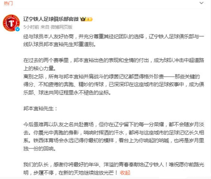 说到转会,这两天还有个让人哭笑不得的消息。中甲辽宁铁人队的队长邦本宜裕离队了,但俱乐部官宣告别的方式有点“慢半拍”——居然是球员的新东家延边龙鼎先宣布了加盟。自家助攻王、队长走了,球迷还是从别人家的公告里知道的,这操作让不少铁人球迷吐槽不已。这虽然是个小插曲,但也从侧面反映出,在职业足球里,球员的流动和俱乐部的运营,时时刻刻都在考验着管理的专业和温度。