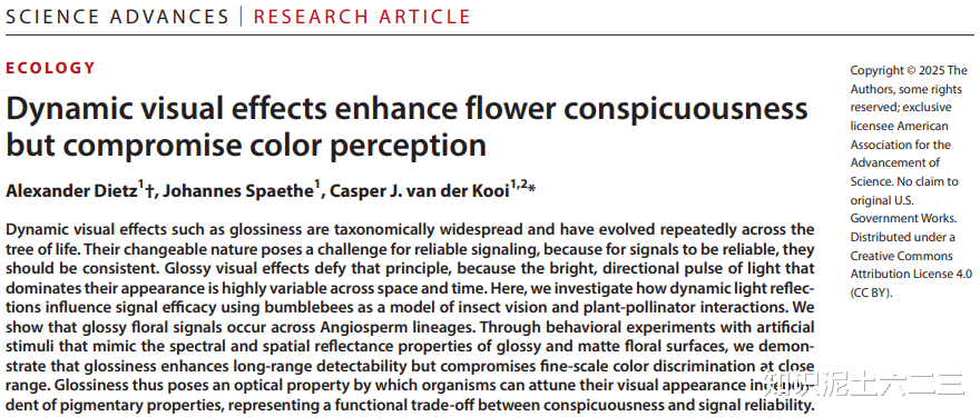 你是否注意过,有些花朵会泛着细腻的光泽,像撒了一层碎钻?这种看似不经意的亮泽,其实藏着植物与 pollinators 之间的进化智慧。最新发表在《Science Advances》上的研究揭示:花朵的光泽是一把 “双刃剑”—— 能让蜜蜂在远处快速发现自己,却会干扰近距离的颜色识别,上演了一场视觉信号的权衡大戏。
