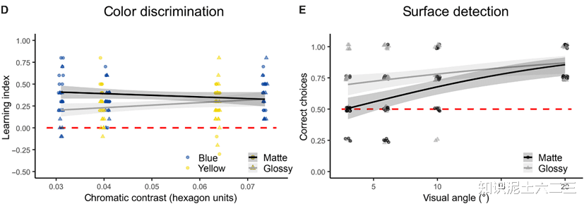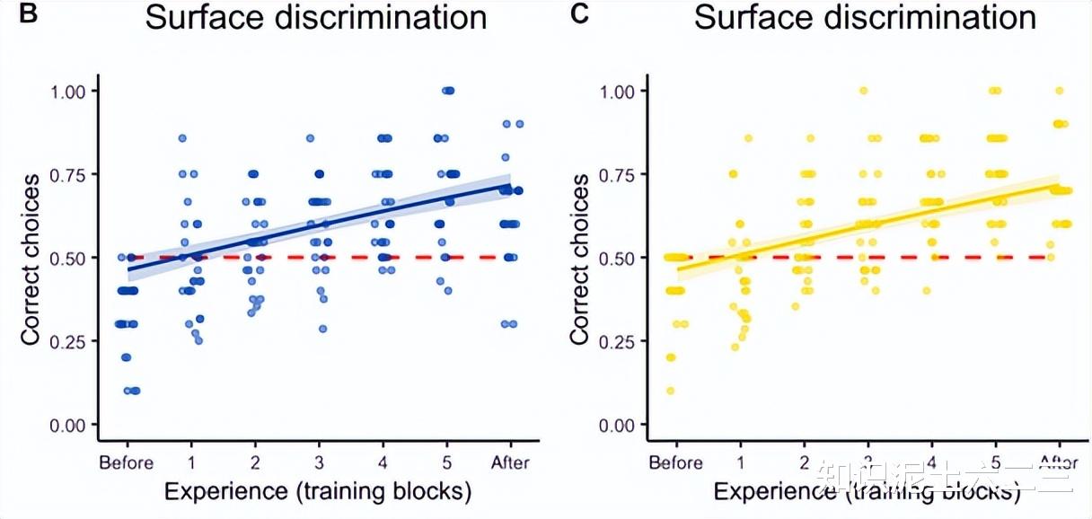 虽然有先天偏好,但蜜蜂的学习能力很强。当把蜜蜂不偏好的表面类型(亮泽或哑光)设为有蔗糖奖励的目标时,随着训练进行,蜜蜂访问奖励刺激的频率越来越高。
