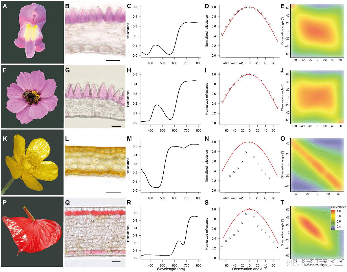 亮泽花朵(如毛茛、红掌)的表皮细胞则是扁平的,光线会形成类似镜面的定向反射,不过这种反射并不完美,反射带宽约 10°-20°,这是花瓣表面的叶脉等不均匀结构造成的。