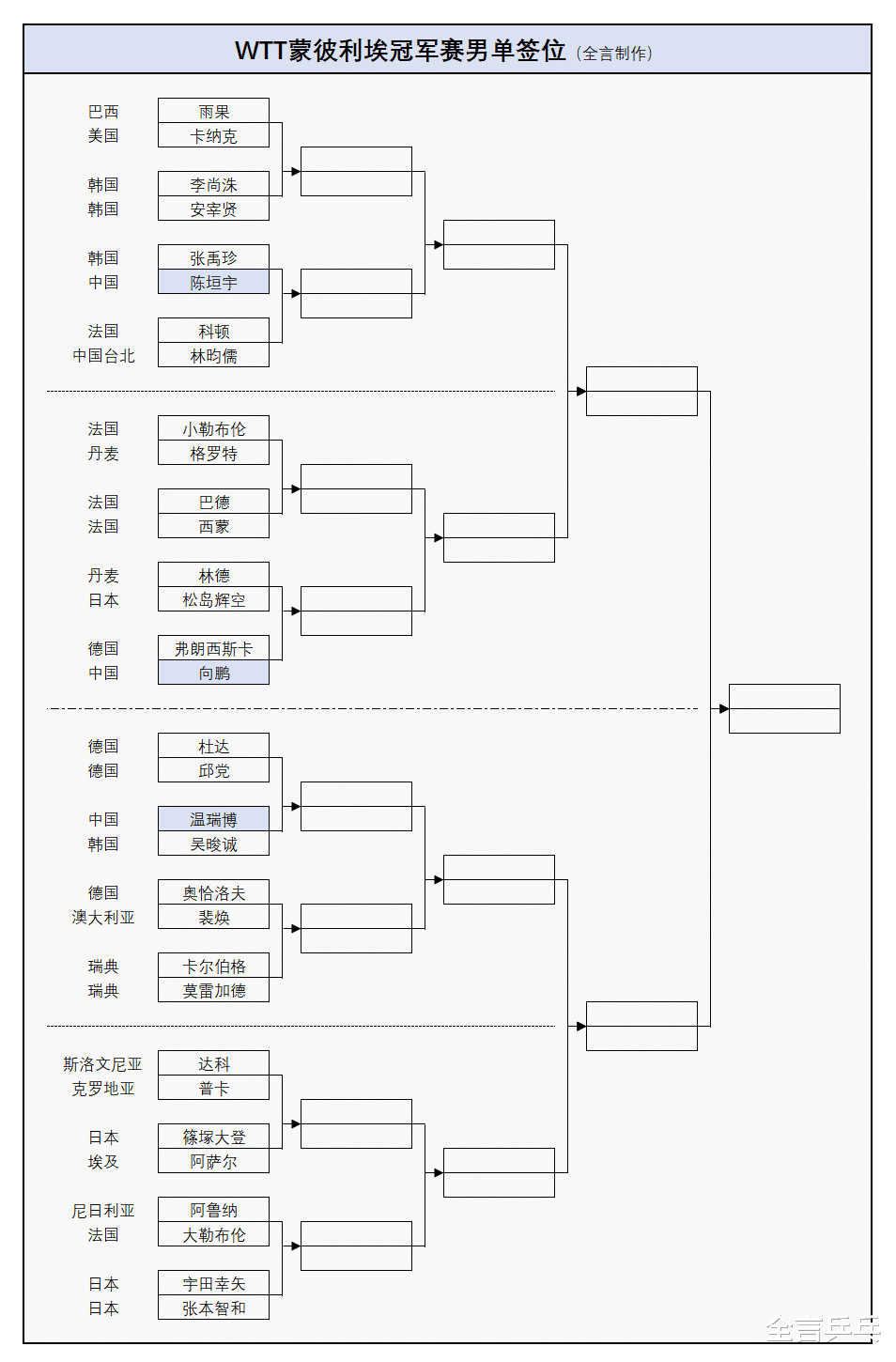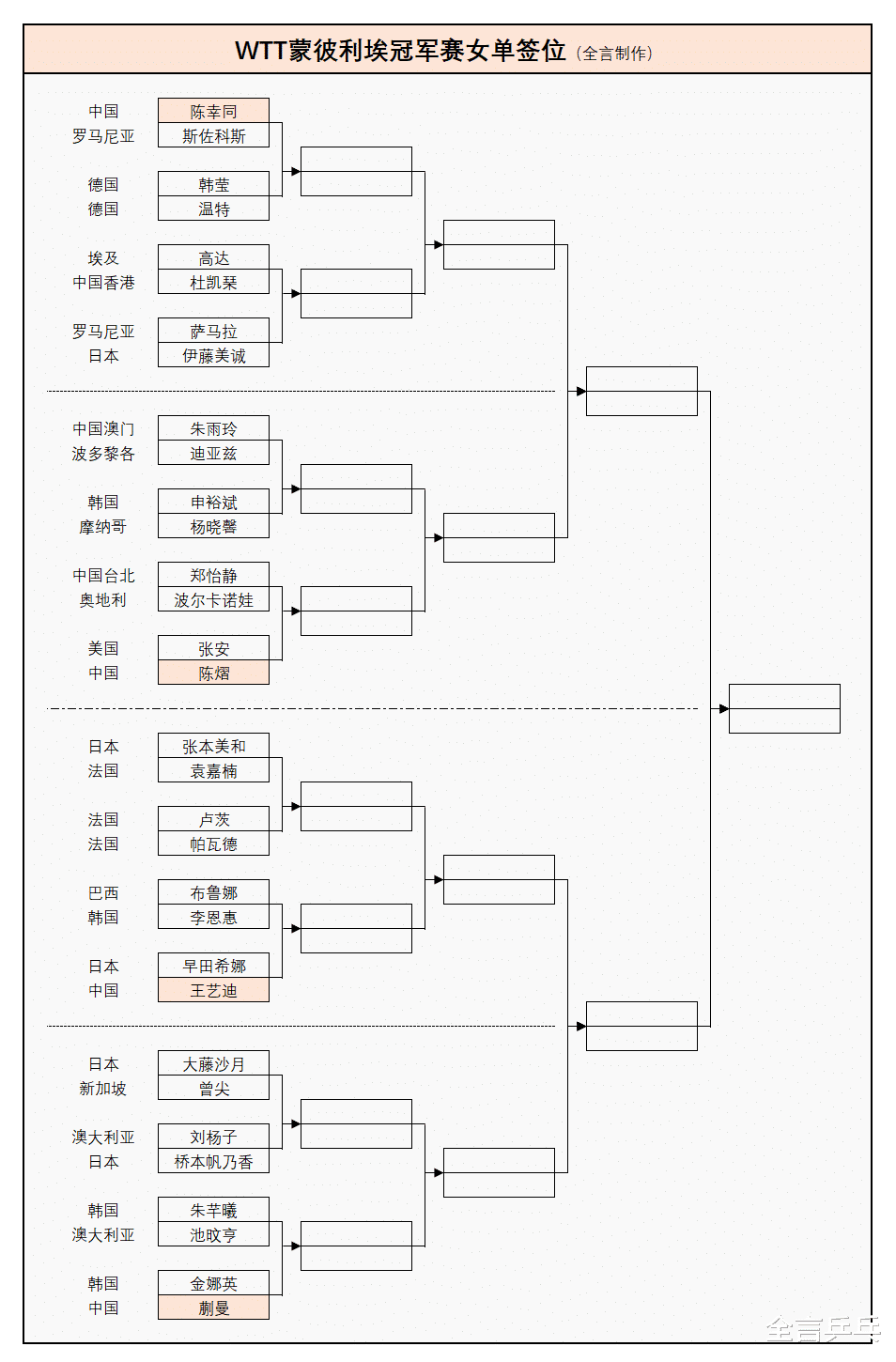 参加本站比赛的国乒女队选手均排名世界前十,其中前3人都是世界冠军主力,大家被均匀分布在不同的1/4区,存在包揽4强的可能;至于男队3人都是非主力运动员,却要面对外协会各路高手的围追堵截,想夺冠有难度——以下为男单、女单的详细签表: