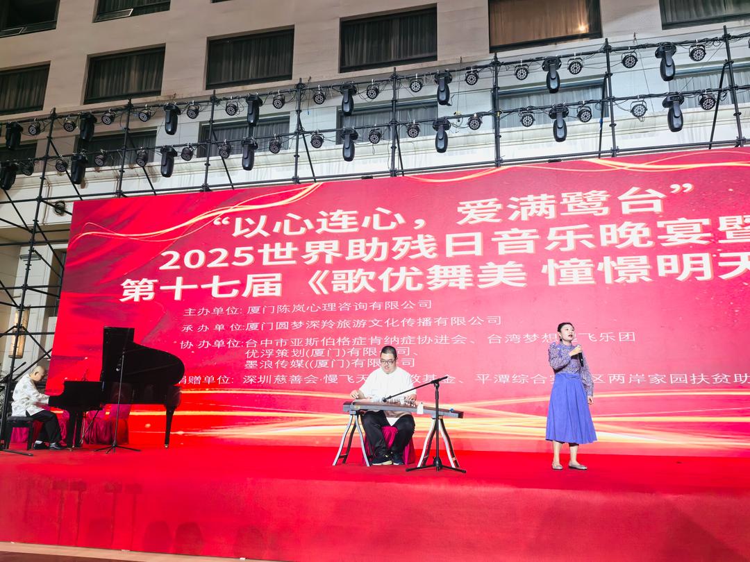 台湾共工新闻社讯(熊馨缘)12月3日晚,翔鹭国际大酒店灯火璀璨、暖意涌动。“以心连心·爱满鹭台——2025孤独症青年音乐交流会”温情启幕,为第34个国际残疾人日增添一抹动人的亮色。活动由厦门陈岚心理咨询有限公司主办,厦门圆梦深羚旅游文化传播有限公司承办,台中市亚斯伯格症肯纳协进会、台湾梦想起飞乐团等机构协办,国际新闻视角报社、台湾共工新闻社等十余家媒体共同支持,并获得深圳慈善会•慢飞天使文教和平潭综合实验区扶贫助残公益服务中心的大力协助。