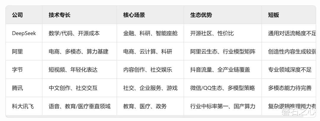 在美国AI领域,有OpenAI、谷歌、亚马逊、Meta、马斯克的xAI这五大巨头,在中国同样有五大科技领军企业,他们是DeepSeek、阿里、字节、腾讯、科大讯飞。而且五大领军企业在AI领域各显神通,通过差异化创新,建立起一个足以与美国对抗的超级战队。