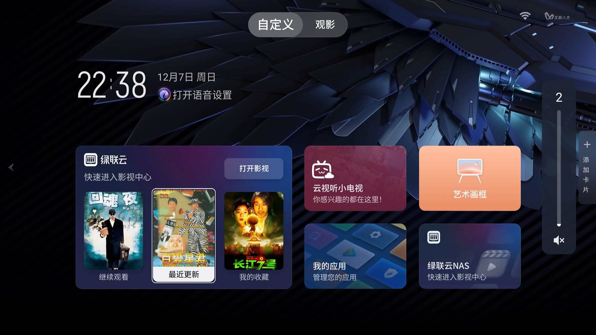 ▼软件方面,其灵控系统3.0无开机广告并内置强大的“媒体中心”功能,支持NAS、本地及网盘内容自动刮削生成海报墙,打造私人影院体验,配合绿联云的小卡片使用体验感更佳。配合伏羲AI大模型语音助手与AI画质增强技术,不仅能智能操作,还能提升低分辨率片源的观看效果。