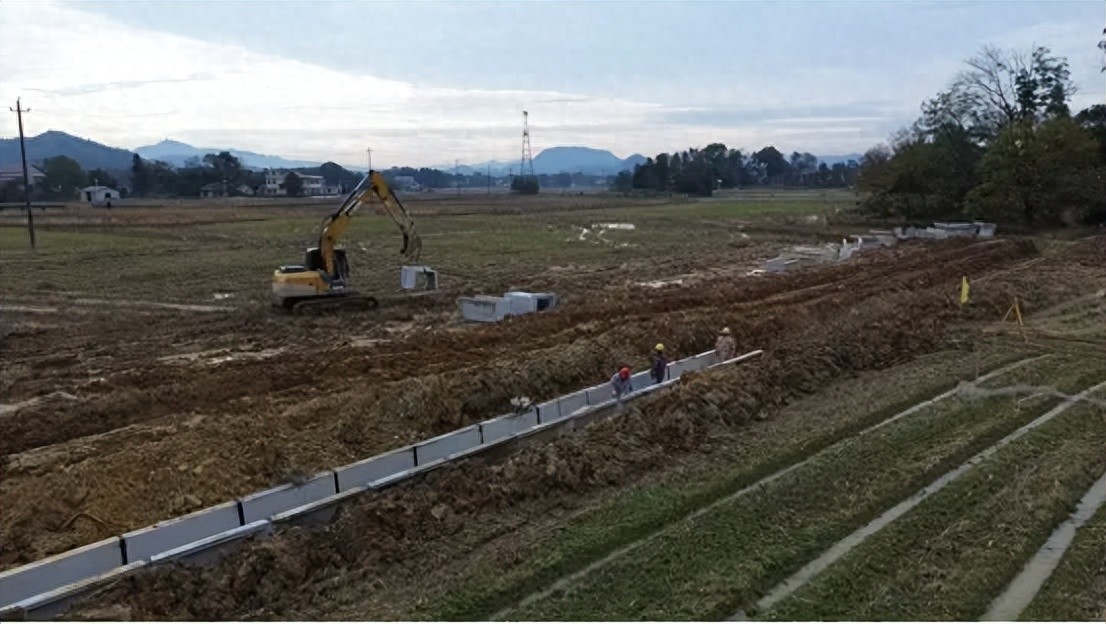 11月20日上午,位于大栗港镇牌形上村的2025年高标准农田建设项目施工现场一片繁忙。两位施工人员默契配合,在挖机师傅的配合下,不到两分钟就将一块长2米、高1米,宽1.36米、重1.75吨的装配式水槽安装到位,单日可完成150米渠道铺设。