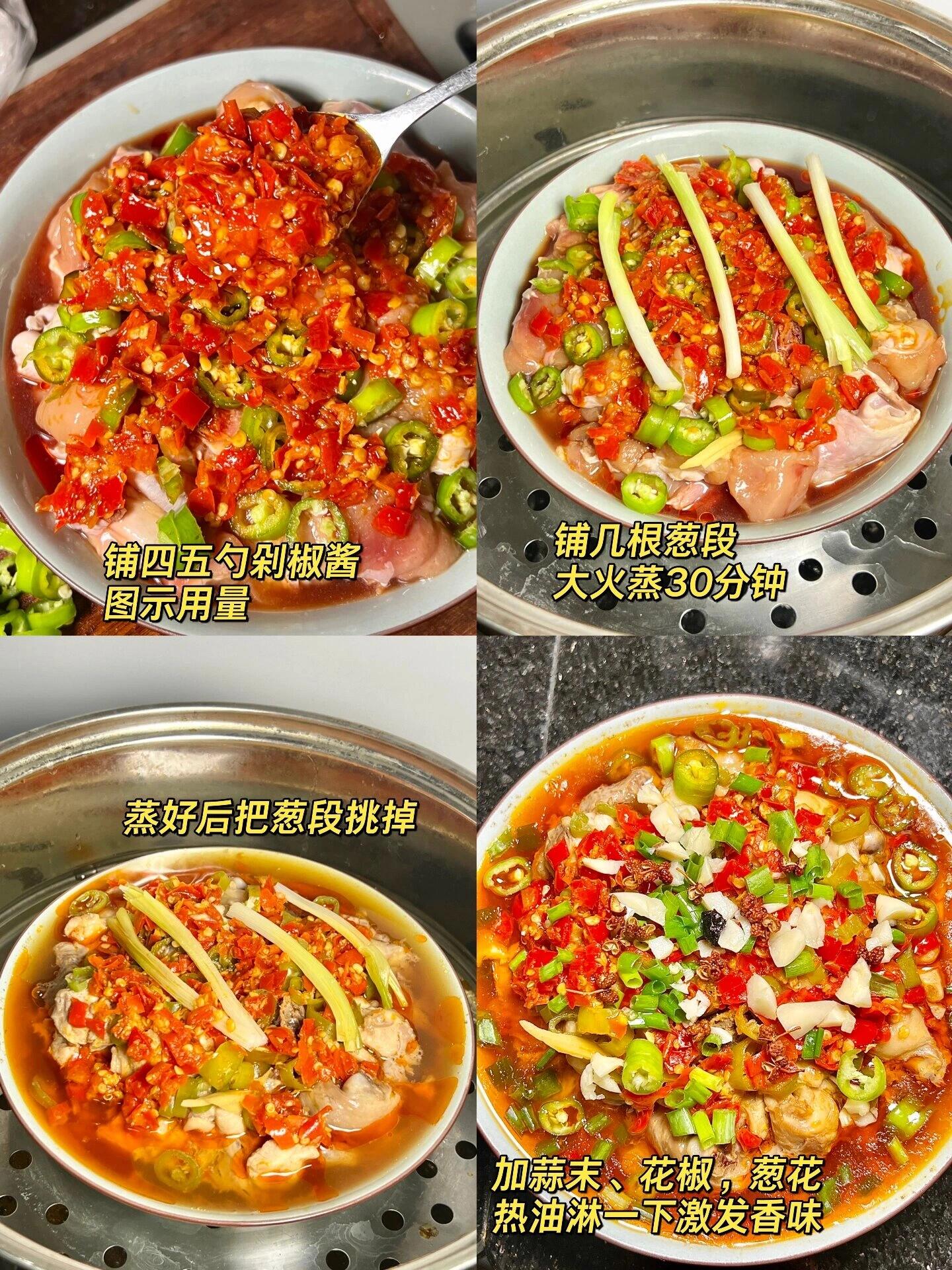 然后,我们还需要铺上四五勺剁椒酱。剁椒酱的用量可以根据个人口味来调整,喜欢辣一点的就多放一些,不太能吃辣的就少放一些。剁椒酱的加入,不仅为菜品增添了丰富的辣味,还带来了鲜艳的色泽,让整道菜看起来更加诱人。
