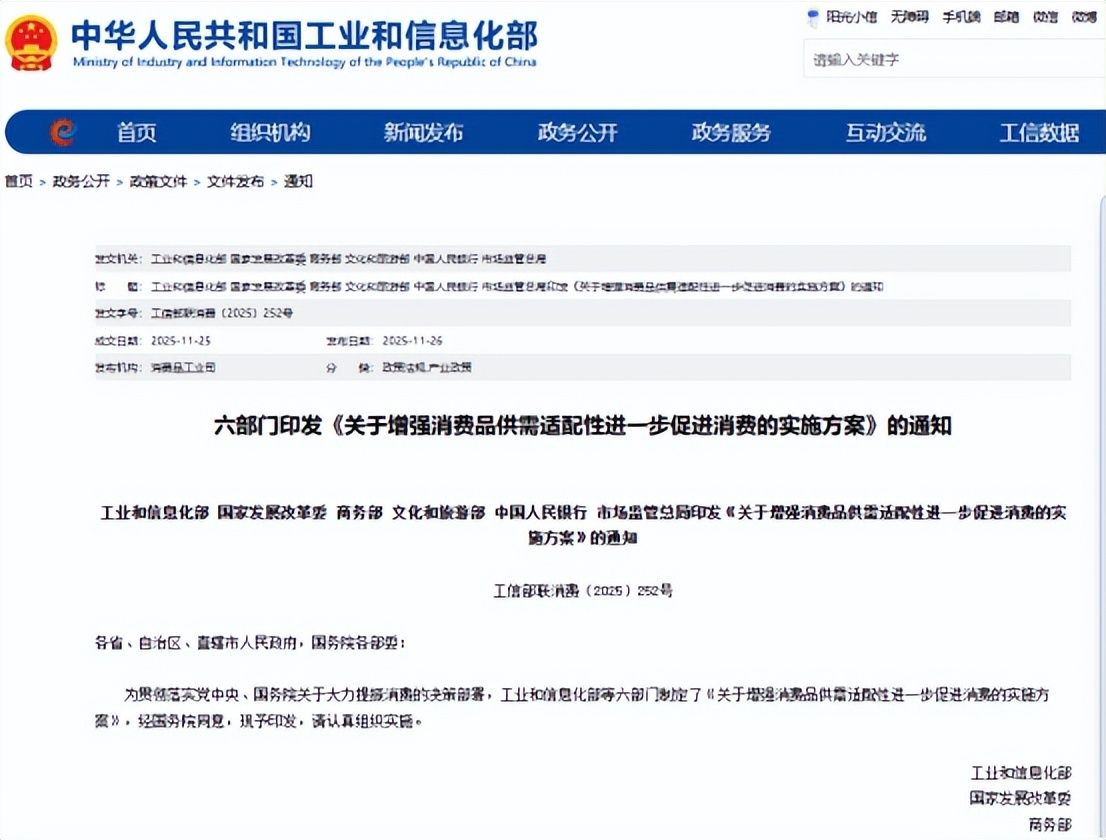 【环球网消费报道 记者 刘晓旭】2025年11月26日,一份关乎中国消费未来十年的重磅文件正式出炉。工信部等六部门联合印发《关于增强消费品供需适配性进一步促进消费的实施方案》,明确提出到2027年形成“3个万亿级消费领域和10个千亿级消费热点”的战略目标。作为党的二十届四中全会后首个国家级促消费文件,这份以“供需适配”为核心的方案,通过5方面19项重点任务,为构建消费驱动型经济增长模式绘制了清晰的“施工图”。