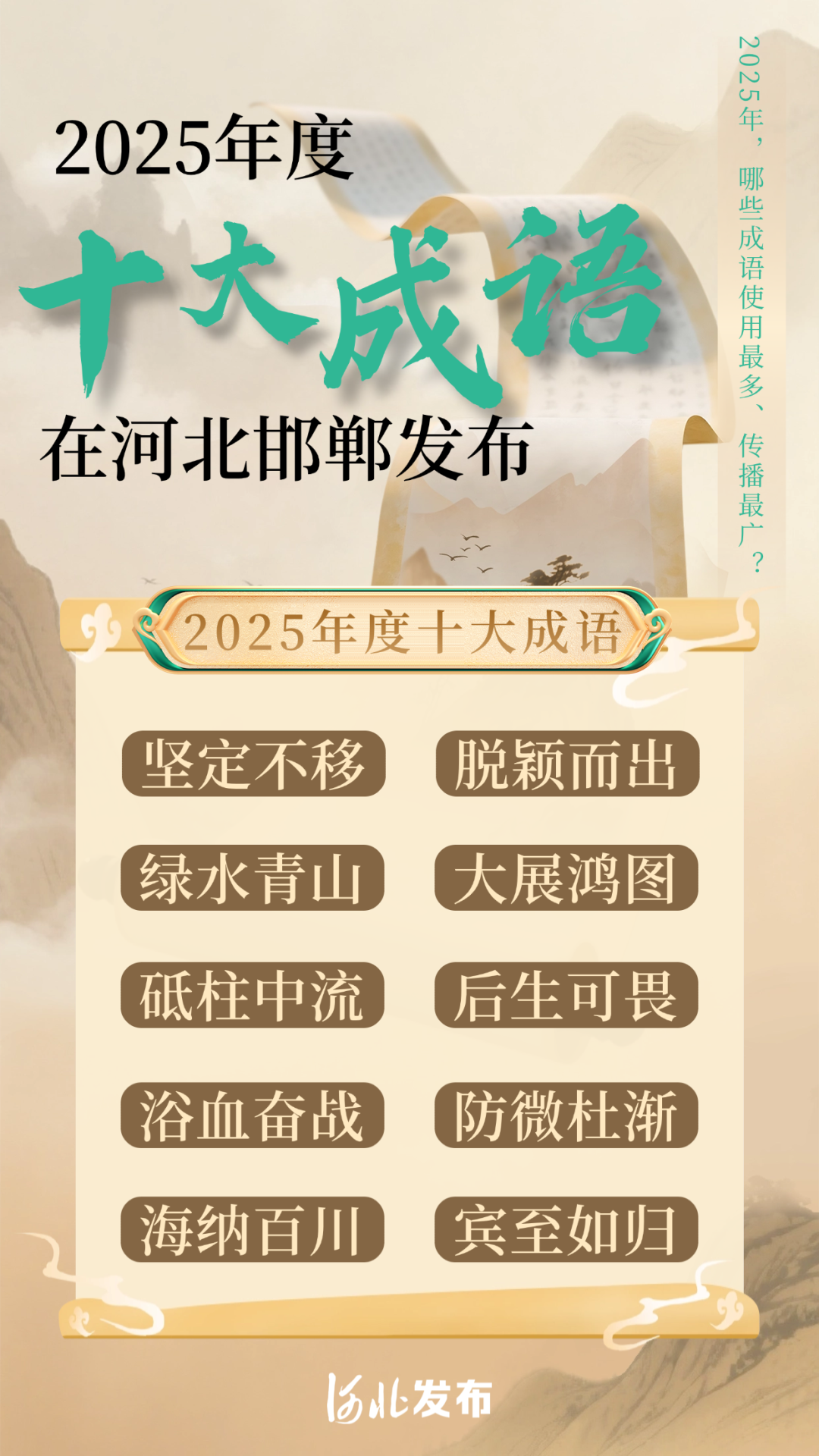 刚刚过去的2025年,哪些成语使用最多、传播最广?1月7日上午,“2025年度成语发布”活动在河北邯郸举行,坚定不移、脱颖而出、绿水青山、大展鸿图、砥柱中流、后生可畏、浴血奋战、防微杜渐、海纳百川、宾至如归等10条成语入选年度成语,其中,“绿水青山”连续两年入选。