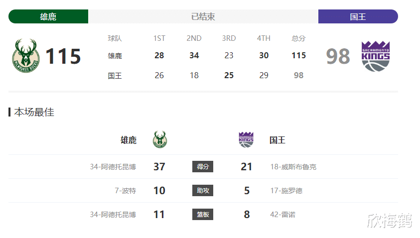雄鹿不仅进攻猛,防守也相当给力!篮板48-38碾压国王,助攻23-17领先,尤其是内线防守,让国王的进攻屡屡受挫!虽然抢断和盖帽数据不如国王,但整体防守效率明显更高!