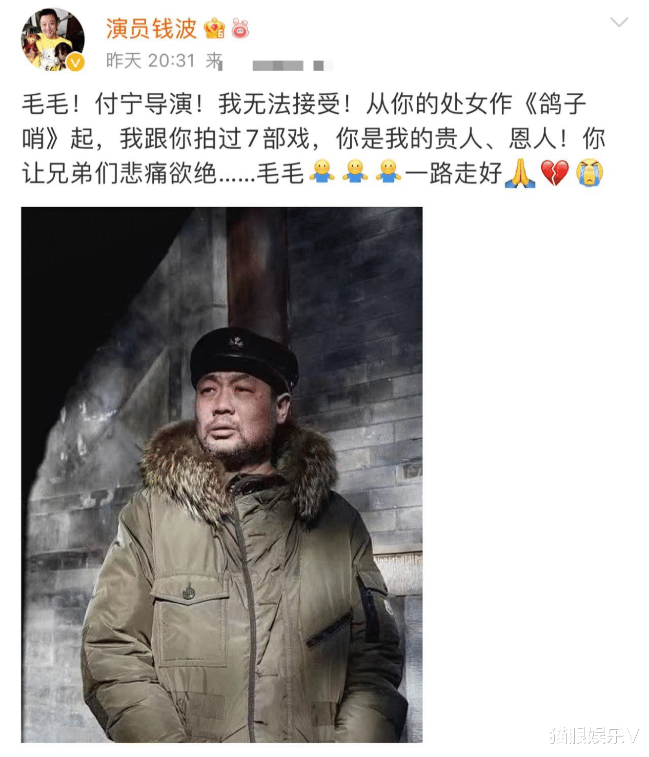 此消息是由演员钱波在社交平台上发文证实的,他在社交平台上悼念付宁导演,称付宁导演,我跟您拍过7部戏,从处女作《鸽子哨》开始,你便是我的贵人、恩人,你的离世让我悲痛欲绝,一路走好,而且在其中也是曝光了付宁的小名,叫毛毛,从他的言语中就能看出,他对付宁的去世而感到惋惜,以及心痛之情,可见两人私下的感情有多好了。