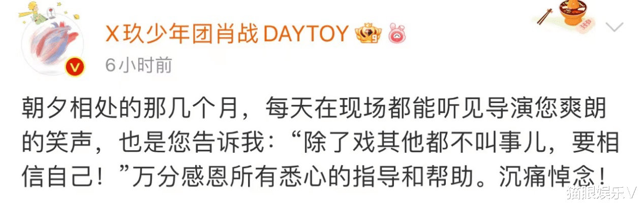 肖战也是在社交平台上发文悼念,此前两人合作过,他也是称感谢付导的细心指导和帮助,也表达了自己对付宁悼念去世的悲痛之情。