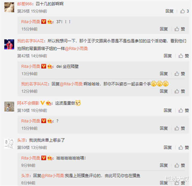 另外,有一些明星的粉丝给rita留言询问,她是不是跟王子文、吴永恩一起参加了这个活动?王子文是一位女明星,之前她官宣了恋情,现在就带着男友一起来看展了。rita对此表示肯定,说自己紧挨着王子文,两人是隔壁。