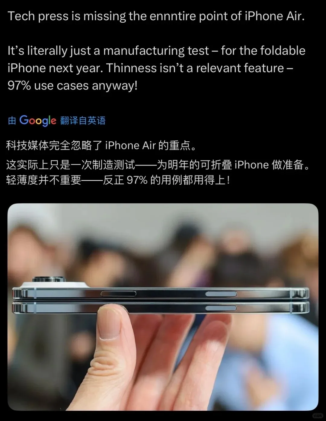 不过,iPhone Air并不会长期保持这个“最薄”的头衔。从爆料信息来看,苹果计划明年推出的首款折叠iPhone将更加极致。在iPhone Air正式发布之前,就已经有不少消息表示,这款轻薄机型就是用来给折叠iPhone铺路的。