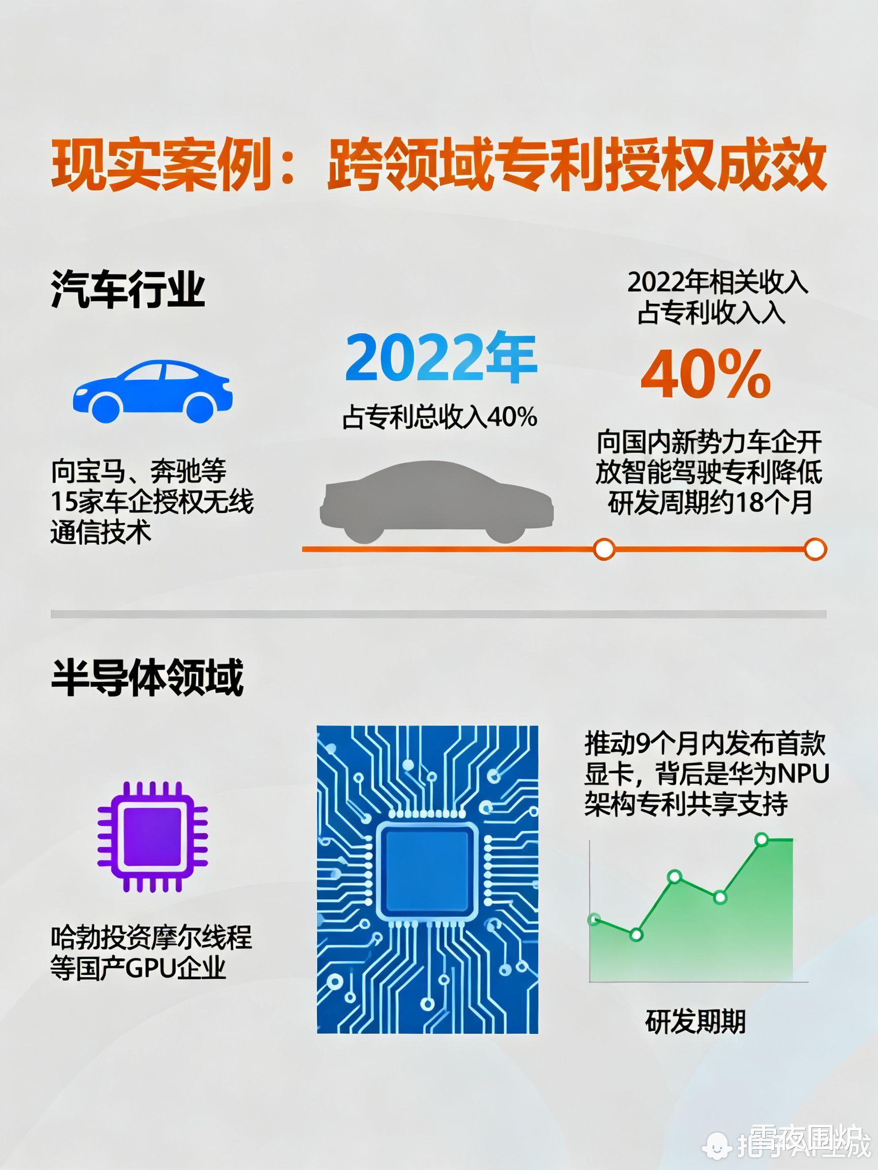 政策联动:响应国家《专利转化运用专项行动方案》,华为通过专利池向350家企业开放许可,其中中小企业占比超60%,覆盖物联网、智能汽车等新兴领域。