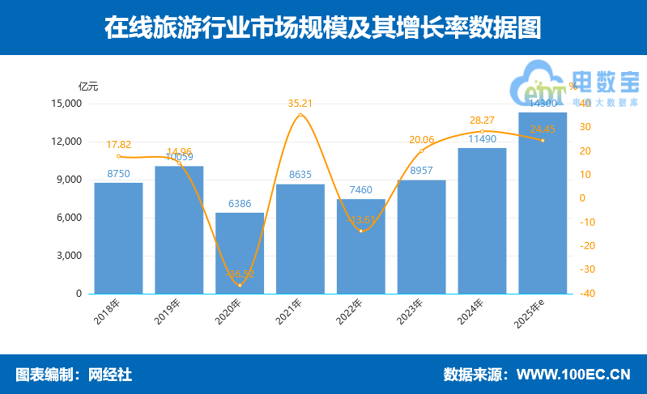 另据我国“一带一路”TOP10影响力社会智库网经社电子商务研究中心发布的《2024年度中国移动出行市场数据报告》显示,2024年在线旅游市场规模为11490亿元,同比增长28.27%。此外,2019年-2023年市场交易规模(增速)分别为10059亿元(14.96 % )、 6386亿元(-36.52% )、8635亿元(35.21%)、7460亿元(-13.61%)、 8957亿元( 20.07% )。据初步估算,2025年在线旅游市场规模约为14300亿元。