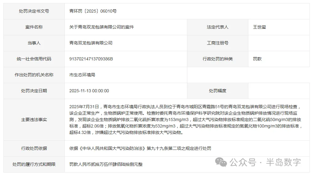 近日,半岛数字从青环罚〔2025〕06010号的《处罚决定书》了解到,青岛双龙包装有限公司被青岛市生态环境局处罚。
