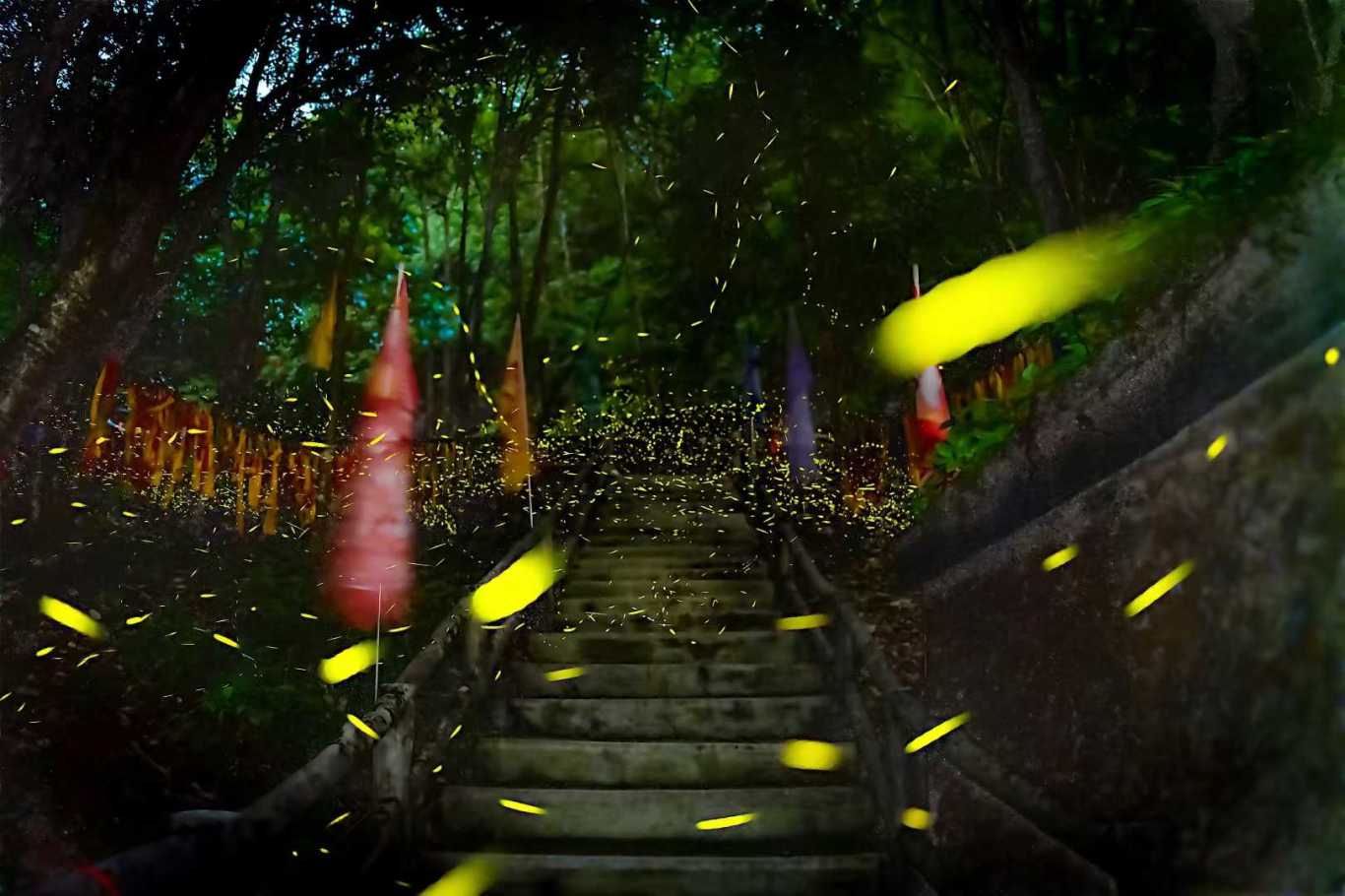 夜幕降临,奇幻林迎来最动人的时刻。数万只萤火虫从草木间苏醒,如银河倾泻般点亮整片山林。它们或盘旋飞舞,或停歇指尖,点点荧光在夜空中交织成流动的星河。游客们手持萤火灯,漫步在光影闪烁的小径,仿佛坠入童话梦境。家长带着孩子追逐萤火,轻声惊叹;情侣依偎同行,在萤火的见证下诉说浪漫。这一刻,盛夏的炽热与萤火的温柔碰撞,绘就独一无二的仲夏夜之梦。