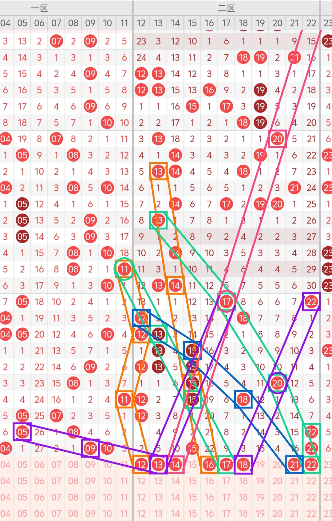 二区号码看好12、13、14、16、17、18、21、22等八号码,可重点参考12、13、16、17、21、22等六枚号码;
