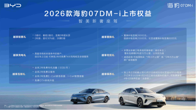 9月15日,智美新奢座驾——2026款海豹07DM-i正式上市,新车共推出4个配置版本,官方指导价格为14.98万元-18.68万元,并推出越享钜惠礼、越享置换礼等六重购车礼遇。2026款海豹07DM-i在“智能、舒适、性能、颜值、安全”五大维度全面进阶,基于全新一代插混整车平台打造,新增云辇-C 智能阻尼车身控制系统、TSC高速爆胎稳定控制系统及天神之眼 B - 辅助驾驶激光版(DiPilot 300)等硬核黑科技,为用户带来高品质出行新体验。