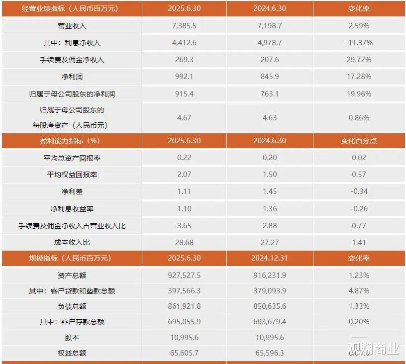 财报显示,2025年上半年哈尔滨银行实现营业收入73.86亿元,同比增长2.59%;归母净利润为9.15亿元,同比增长19.96%。截至6月末,资产总额为9275.28亿元,较上年末增加1.23%。