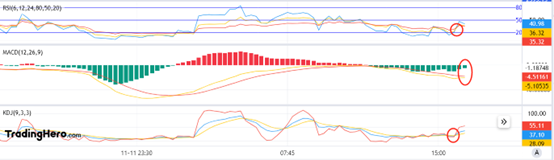 结合指标来看,RSI相对强弱指标长期触及50以下,已经出现低位金叉;MACD绿柱放量动能减弱,快慢线即将出现水下金叉;KDJ指标在麻花纠叠之后出现低位金叉后抬头。比较符合预期,都暗示着后市B浪的出现,即将回调上升。